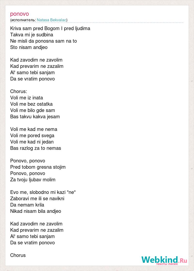 Kriva sam pred Bogom I pred ljudima Takva mi je sudbina Ne misli da ponosna sam na to Sto nisam andjeo Kad zavodim ne zavolim Kad prevarim ne zazalim Al' samo tebi sanjam Da se vratim ponovo Chorus: Voli me iz inata Voli me bez ostatka Voli me bilo gde sam Bas takvu kakva jesam Voli me kad me nema Voli me pored svega Voli me kad ni jedan Bas razlog za to nemas Ponovo, ponovo Pred tobom gresna stojim Ponovo, ponovo Za tvoju ljubav molim Evo me, slobodno mi kazi "ne" Zaboravi me ili se navikni Da nemam krila Nikad nisam bila andjeo Kad zavodim ne zavolim Kad prevarim ne zazalim Al' samo tebi sanjam Da se vratim ponovo Chorus