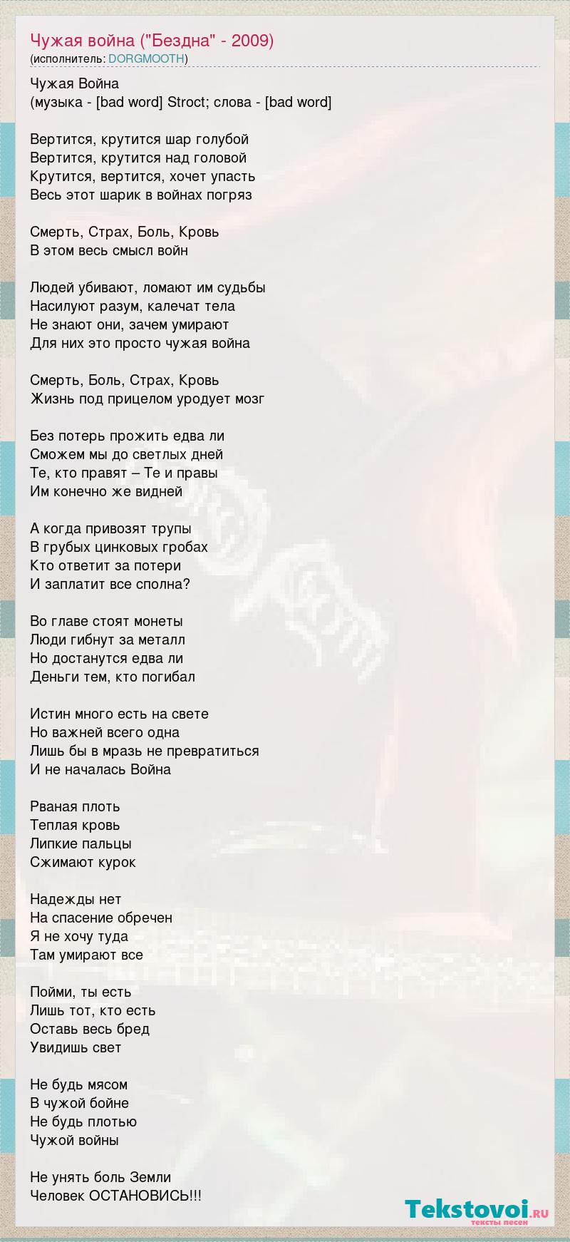 Чужая Война (музыка - Sairus/Stroct; слова - Sairus) Вертится, крутится шар голубой Вертится, крутится над головой Крутится, вертится, хочет упасть Весь этот шарик в войнах погряз Смерть, Страх, Боль, Кровь В этом весь смысл войн Людей убивают, ломают им судьбы Насилуют разум, калечат тела Не знают они, зачем умирают Для них это просто чужая война Смерть, Боль, Страх, Кровь Жизнь под прицелом уродует мозг Без потерь прожить едва ли Сможем мы до светлых дней Те, кто правят – Те и правы Им конечно же видней А когда привозят трупы В грубых цинковых гробах Кто ответит за потери И заплатит все сполна? Во главе стоят монеты Люди гибнут за металл Но достанутся едва ли Деньги тем, кто погибал Истин много есть на свете Но важней всего одна Лишь бы в мразь не превратиться И не началась Война Рваная плоть Теплая кровь Липкие пальцы Сжимают курок Надежды нет На спасение обречен Я не хочу туда Там умирают все Пойми, ты есть Лишь тот, кто есть Оставь весь бред Увидишь свет Не будь мясом В чужой бойне Не будь плотью Чужой войны Не унять боль Земли Человек ОСТАНОВИСЬ!!!