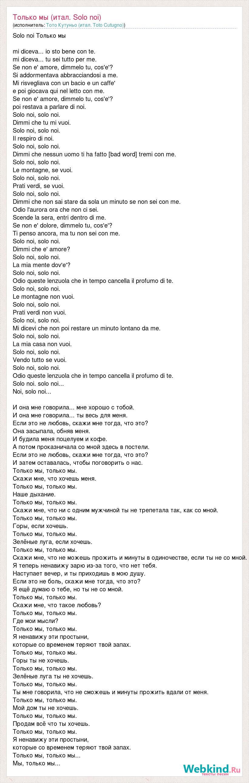 Solo noi Только мы mi diceva... io sto bene con te. mi diceva... tu sei tutto per me. Se non e' amore, dimmelo tu, cos'e'? Si addormentava abbracciandosi a me. Mi risvegliava con un bacio e un caffe' e poi giocava qui nel letto con me. Se non e' amore, dimmelo tu, cos'e'? poi restava a parlare di noi. Solo noi, solo noi. Dimmi che tu mi vuoi. Solo noi, solo noi. Il respiro di noi. Solo noi, solo noi. Dimmi che nessun uomo ti ha fatto [bad word] tremi con me. Solo noi, solo noi. Le montagne, se vuoi. Solo noi, solo noi. Prati verdi, se vuoi. Solo noi, solo noi. Dimmi che non sai stare da sola un minuto se non sei con me. Odio l'aurora ora che non ci sei. Scende la sera, entri dentro di me. Se non e' dolore, dimmelo tu, cos'e'? Ti penso ancora, ma tu non sei con me. Solo noi, solo noi. Dimmi che e' amore? Solo noi, solo noi. La mia mente dov'e'? Solo noi, solo noi. Odio queste lenzuola che in tempo cancella il profumo di te. Solo noi, solo noi. Le montagne non vuoi. Solo noi, solo noi. Prati verdi non vuoi. Solo noi, solo noi. Mi dicevi che non poi restare un minuto lontano da me. Solo noi, solo noi. La mia casa non vuoi. Solo noi, solo noi. Vendo tutto se vuoi. Solo noi, solo noi. Odio queste lenzuola che in tempo cancella il profumo di te. Solo noi. solo noi... Noi, solo noi... И она мне говорила... мне хорошо с тобой. И она мне говорила... ты весь для меня. Если это не любовь, скажи мне тогда, что это? Она засыпала, обняв меня. И будила меня поцелуем и кофе. А потом проказничала со мной здесь в постели. Если это не любовь, скажи мне тогда, что это? И затем оставалась, чтобы поговорить о нас. Только мы, только мы. Скажи мне, что хочешь меня. Только мы, только мы. Наше дыхание. Только мы, только мы. Скажи мне, что ни с одним мужчиной ты не трепетала так, как со мной. Только мы, только мы. Горы, если хочешь. Только мы, только мы. Зелёные луга, если хочешь. Только мы, только мы. Скажи мне, что не можешь прожить и минуты в одиночестве, если ты не со мной. Я теперь ненавижу зарю из-за того, что нет тебя. Наступает вечер, и ты приходишь в мою душу. Если это не боль, скажи мне тогда, что это? Я ещё думаю о тебе, но ты не со мной. Только мы, только мы. Скажи мне, что такое любовь? Только мы, только мы. Где мои мысли? Только мы, только мы. Я ненавижу эти простыни, которые со временем теряют твой запах. Только мы, только мы. Горы ты не хочешь. Только мы, только мы. Зелёные луга ты не хочешь. Только мы, только мы. Ты мне говорила, что не сможешь и минуты прожить вдали от меня. Только мы, только мы. Мой дом ты не хочешь. Только мы, только мы. Продам всё что ты хочешь. Только мы, только мы. Я ненавижу эти простыни, которые со временем теряют твой запах. Только мы, только мы... Мы, только мы...