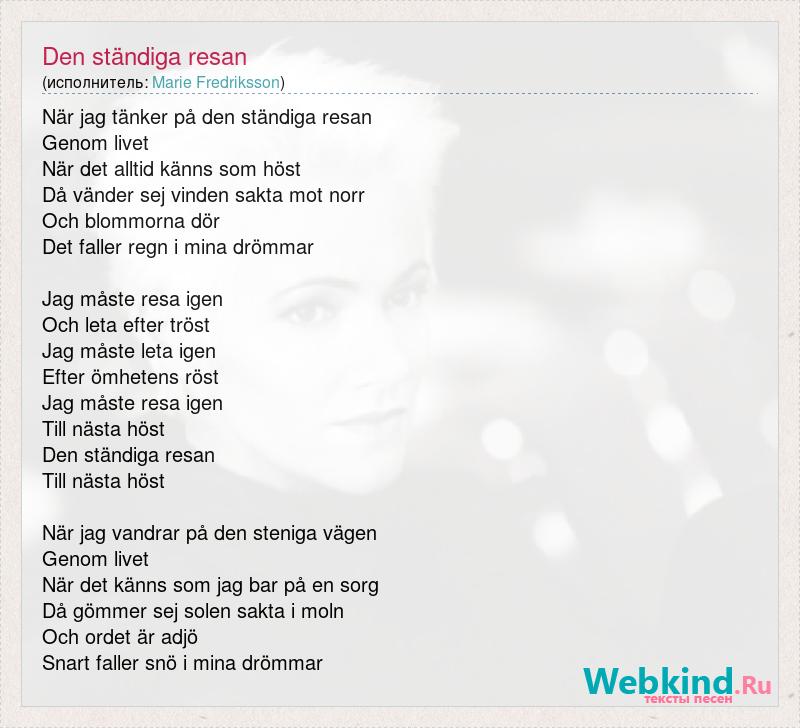 När jag tänker på den ständiga resan Genom livet När det alltid känns som höst Då vänder sej vinden sakta mot norr Och blommorna dör Det faller regn i mina drömmar Jag måste resa igen Och leta efter tröst Jag måste leta igen Efter ömhetens röst Jag måste resa igen Till nästa höst Den ständiga resan Till nästa höst När jag vandrar på den steniga vägen Genom livet När det känns som jag bar på en sorg Då gömmer sej solen sakta i moln Och ordet är adjö Snart faller snö i mina drömmar