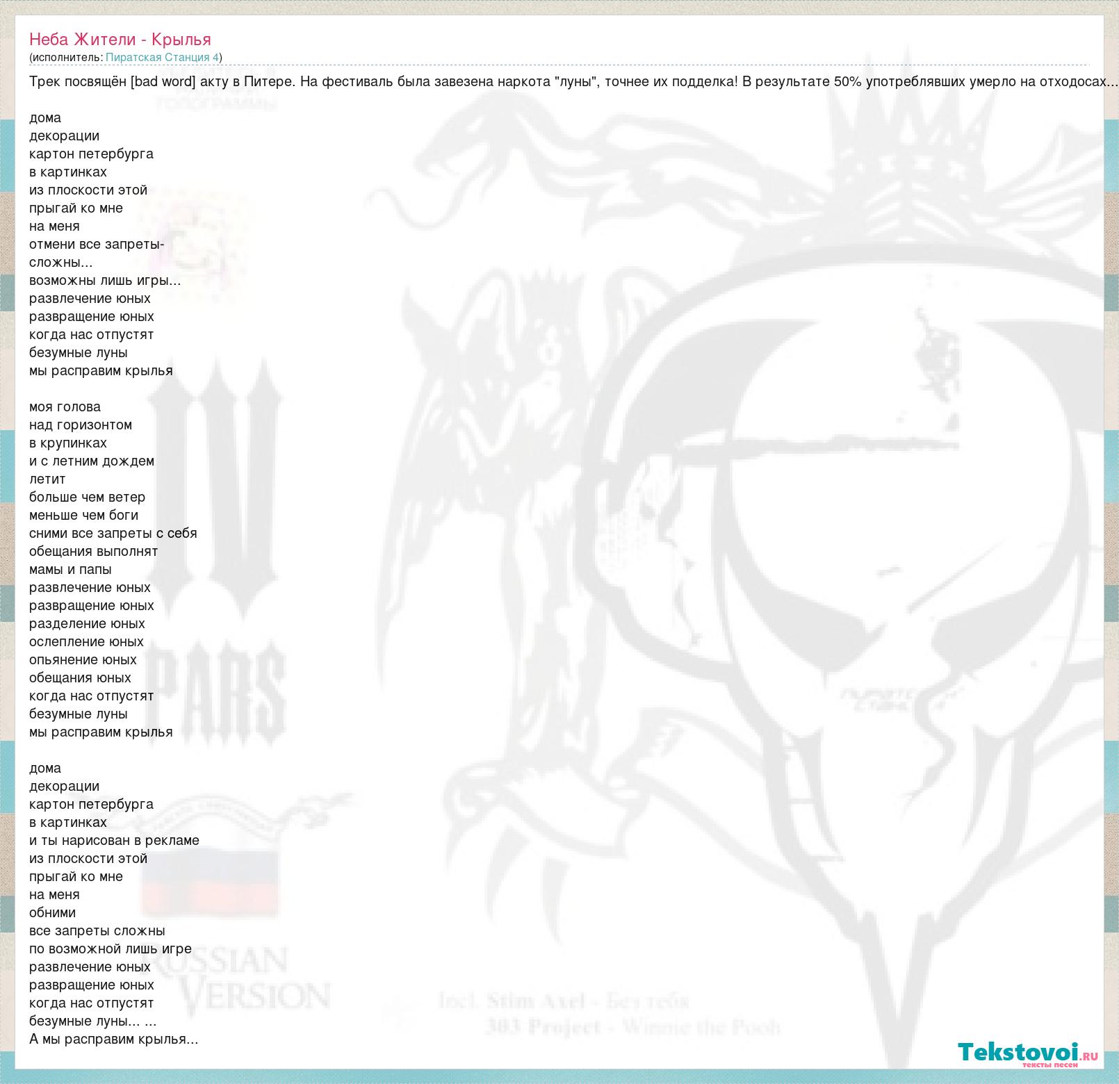 Трек посвящён [bad word] акту в Питере. На фестиваль была завезена наркота "луны", точнее их подделка! В результате 50% употреблявших умерло на отходосах... дома декорации картон петербурга в картинках из плоскости этой прыгай ко мне на меня отмени все запреты- сложны... возможны лишь игры... развлечение юных развращение юных когда нас отпустят безумные луны мы расправим крылья моя голова над горизонтом в крупинках и с летним дождем летит больше чем ветер меньше чем боги сними все запреты с себя обещания выполнят мамы и папы развлечение юных развращение юных разделение юных ослепление юных опьянение юных обещания юных когда нас отпустят безумные луны мы расправим крылья дома декорации картон петербурга в картинках и ты нарисован в рекламе из плоскости этой прыгай ко мне на меня обними все запреты сложны по возможной лишь игре развлечение юных развращение юных когда нас отпустят безумные луны... ... А мы расправим крылья...