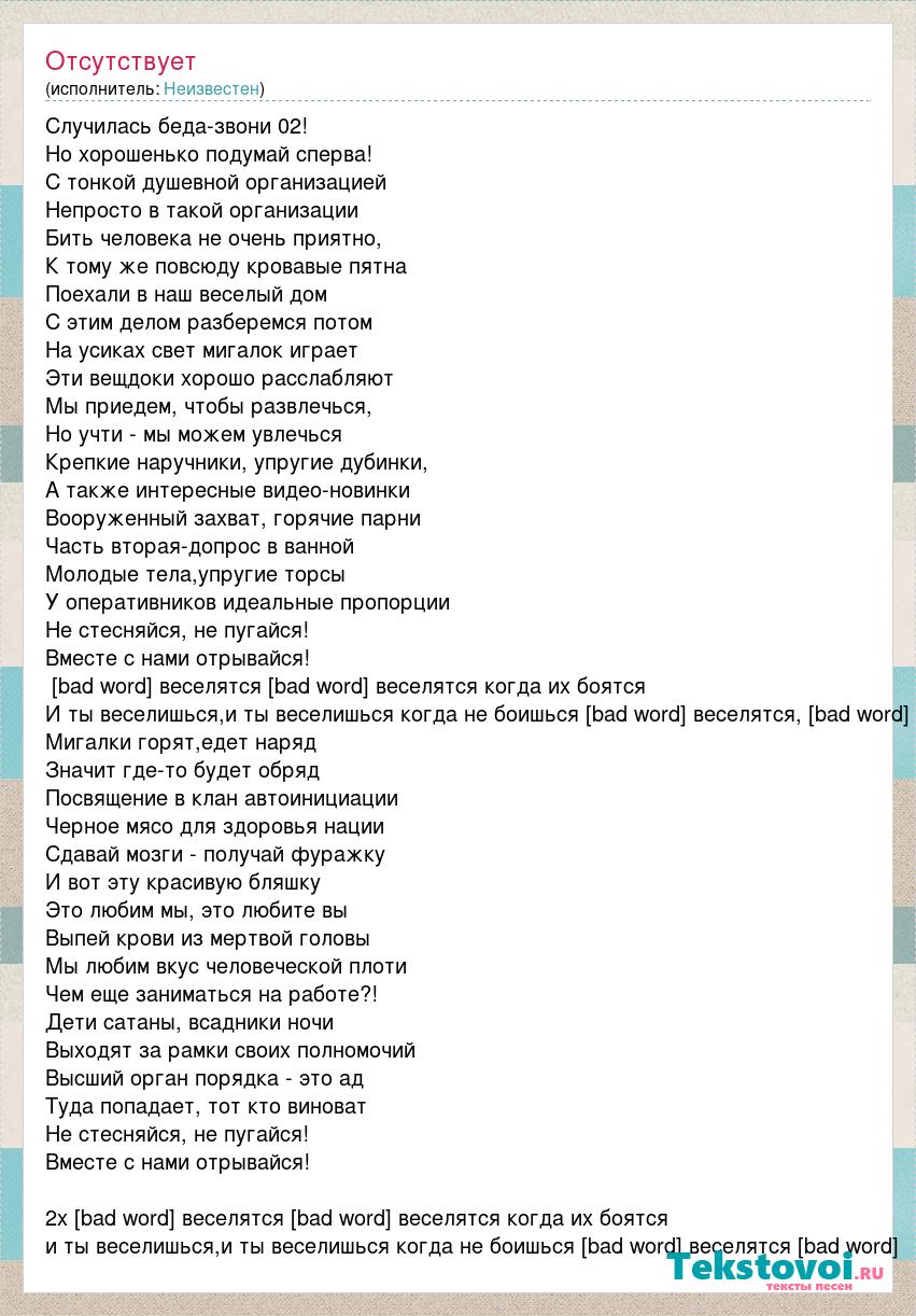Случилась беда-звони 02! Но хорошенько подумай сперва! С тонкой душевной организацией Непросто в такой организации Бить человека не очень приятно, К тому же повсюду кровавые пятна Поехали в наш веселый дом С этим делом разберемся потом На усиках свет мигалок играет Эти вещдоки хорошо расслабляют Мы приедем, чтобы развлечься, Но учти - мы можем увлечься Крепкие наручники, упругие дубинки, А также интересные видео-новинки Вооруженный захват, горячие парни Часть вторая-допрос в ванной Молодые тела,упругие торсы У оперативников идеальные пропорции Не стесняйся, не пугайся! Вместе с нами отрывайся! [bad word] веселятся [bad word] веселятся когда их боятся И ты веселишься,и ты веселишься когда не боишься [bad word] веселятся, [bad word] Мигалки горят,едет наряд Значит где-то будет обряд Посвящение в клан автоинициации Черное мясо для здоровья нации Сдавай мозги - получай фуражку И вот эту красивую бляшку Это любим мы, это любите вы Выпей крови из мертвой головы Мы любим вкус человеческой плоти Чем еще заниматься на работе?! Дети сатаны, всадники ночи Выходят за рамки своих полномочий Высший орган порядка - это ад Туда попадает, тот кто виноват Не стесняйся, не пугайся! Вместе с нами отрывайся! 2х [bad word] веселятся [bad word] веселятся когда их боятся и ты веселишься,и ты веселишься когда не боишься [bad word] веселятся [bad word]