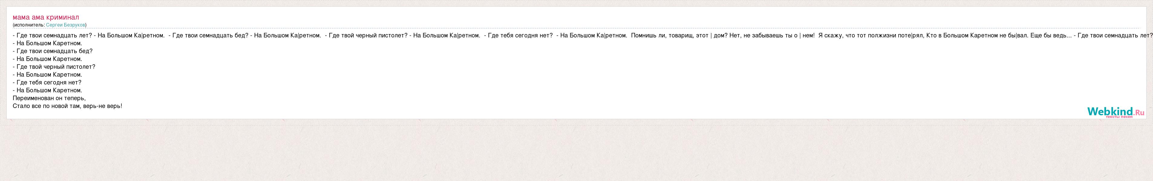- Где твои семнадцать лет? - На Большом Ка|ретном. - Где твои семнадцать бед? - На Большом Ка|ретном. - Где твой черный пистолет? - На Большом Ка|ретном. - Где тебя сегодня нет? - На Большом Ка|ретном. Помнишь ли, товарищ, этот | дом? Нет, не забываешь ты о | нем! Я скажу, что тот полжизни поте|рял, Кто в Большом Каретном не бы|вал. Еще бы ведь... - Где твои семнадцать лет? - На Большом Каретном. - Где твои семнадцать бед? - На Большом Каретном. - Где твой черный пистолет? - На Большом Каретном. - Где тебя сегодня нет? - На Большом Каретном. Переименован он теперь, Стало все по новой там, верь-не верь!
