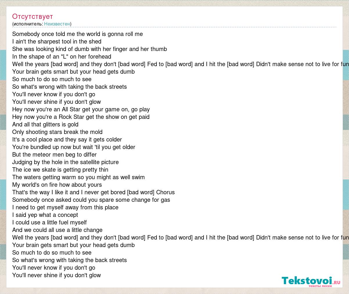 Somebody once told me the world is gonna roll me I ain't the sharpest tool in the shed She was looking kind of dumb with her finger and her thumb In the shape of an "L" on her forehead Well the years start coming and they don't stop coming Fed to the rules and I hit the ground running Didn't make sense not to live for fun Your brain gets smart but your head gets dumb So much to do so much to see So what's wrong with taking the back streets You'll never know if you don't go You'll never shine if you don't glow Hey now you're an All Star get your game on, go play Hey now you're a Rock Star get the show on get paid And all that glitters is gold Only shooting stars break the mold It's a cool place and they say it gets colder You're bundled up now but wait 'til you get older But the meteor men beg to differ Judging by the hole in the satellite picture The ice we skate is getting pretty thin The waters getting warm so you might as well swim My world's on fire how about yours That's the way I like it and I never get bored Chorus Chorus Somebody once asked could you spare some change for gas I need to get myself away from this place I said yep what a concept I could use a little fuel myself And we could all use a little change Well the years start coming and they don't stop coming Fed to the rules and I hit the ground running Didn't make sense not to live for fun Your brain gets smart but your head gets dumb So much to do so much to see So what's wrong with taking the back streets You'll never know if you don't go You'll never shine if you don't glow