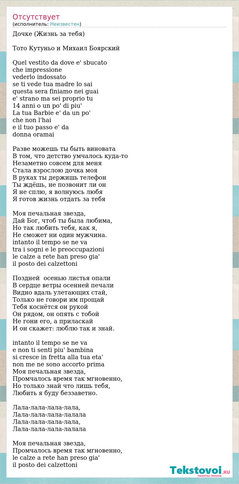 Дочке (Жизнь за тебя) Тото Кутуньо и Михаил Боярский Quel vestito da dove e' sbucato che impressione vederlo indossato se ti vede tua madre lo sai questa sera finiamo nei guai e' strano ma sei proprio tu 14 anni o un po' di piu' La tua Barbie e' da un po' che non l'hai e il tuo passo e' da donna oramai Разве можешь ты быть виновата В том, что детство умчалось куда-то Незаметно совсем для меня Стала взрослою дочка моя В руках ты держишь телефон Ты ждёшь, не позвонит ли он Я не сплю, я волнуюсь любя Я готов жизнь отдать за тебя Моя печальная звезда, Дай Бог, чтоб ты была любима, Но так любить тебя, как я, Не сможет ни один мужчина. intanto il tempo se ne va tra i sogni e le preoccupazioni le calze a rete han preso gia' il posto dei calzettoni Поздней осенью листья опали В сердце ветры осенней печали Видно вдаль улетающих стай, Только не говори им прощай Тебя коснётся он рукой Он рядом, он опять с тобой Не гони его, а приласкай И он скажет: люблю так и знай. intanto il tempo se ne va e non ti senti piu' bambina si cresce in fretta alla tua eta' non me ne sono accorto prima Моя печальная звезда, Промчалось время так мгновенно, Но только знай что лишь тебя, Любить я буду беззаветно. Лала-лала-лала-лала, Лала-лала-лала-лалала Лала-лала-лала-лала, Лала-лала-лала-лалала Моя печальная звезда, Промчалось время так мгновенно, le calze a rete han preso gia' il posto dei calzettoni