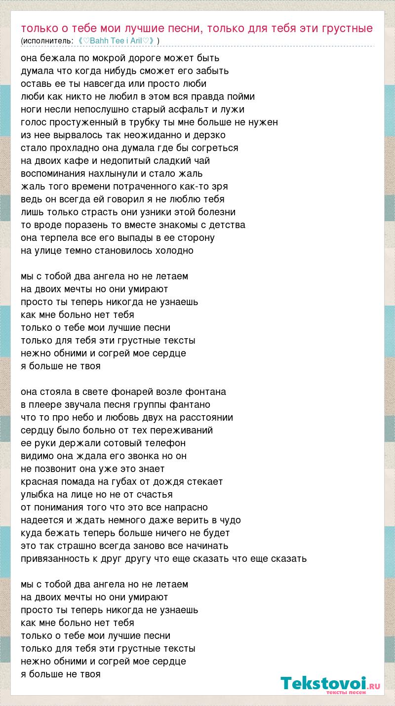 она бежала по мокрой дороге может быть думала что когда нибудь сможет его забыть оставь ее ты навсегда или просто люби люби как никто не любил в этом вся правда пойми ноги несли непослушно старый асфальт и лужи голос простуженный в трубку ты мне больше не нужен из нее вырвалось так неожиданно и дерзко стало прохладно она думала где бы согреться на двоих кафе и недопитый сладкий чай воспоминания нахлынули и стало жаль жаль того времени потраченного как-то зря ведь он всегда ей говорил я не люблю тебя лишь только страсть они узники этой болезни то вроде поразень то вместе знакомы с детства она терпела все его выпады в ее сторону на улице темно становилось холодно мы с тобой два ангела но не летаем на двоих мечты но они умирают просто ты теперь никогда не узнаешь как мне больно нет тебя только о тебе мои лучшие песни только для тебя эти грустные тексты нежно обними и согрей мое сердце я больше не твоя она стояла в свете фонарей возле фонтана в плеере звучала песня группы фантано что то про небо и любовь двух на расстоянии сердцу было больно от тех переживаний ее руки держали сотовый телефон видимо она ждала его звонка но он не позвонит она уже это знает красная помада на губах от дождя стекает улыбка на лице но не от счастья от понимания того что это все напрасно надеется и ждать немного даже верить в чудо куда бежать теперь больше ничего не будет это так страшно всегда заново все начинать привязанность к друг другу что еще сказать что еще сказать мы с тобой два ангела но не летаем на двоих мечты но они умирают просто ты теперь никогда не узнаешь как мне больно нет тебя только о тебе мои лучшие песни только для тебя эти грустные тексты нежно обними и согрей мое сердце я больше не твоя