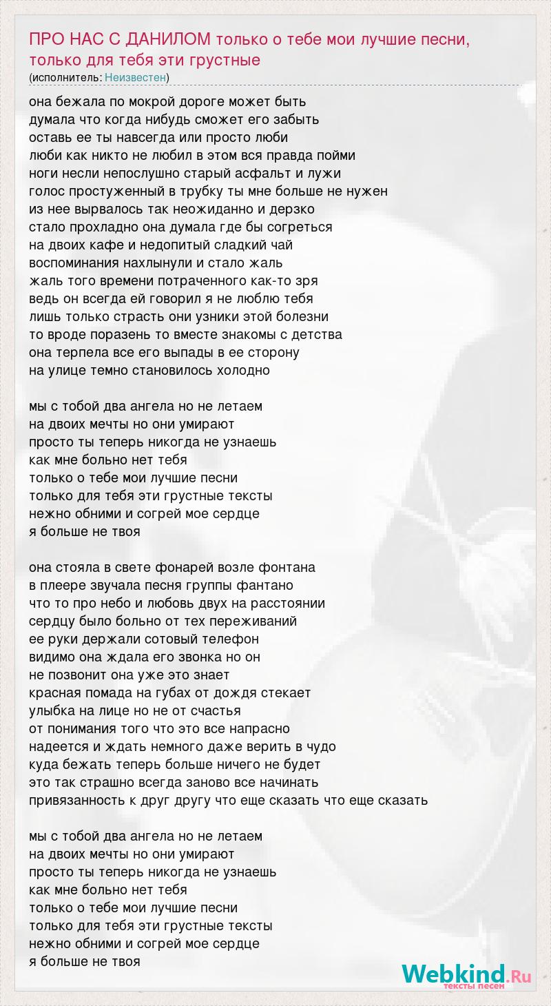 она бежала по мокрой дороге может быть думала что когда нибудь сможет его забыть оставь ее ты навсегда или просто люби люби как никто не любил в этом вся правда пойми ноги несли непослушно старый асфальт и лужи голос простуженный в трубку ты мне больше не нужен из нее вырвалось так неожиданно и дерзко стало прохладно она думала где бы согреться на двоих кафе и недопитый сладкий чай воспоминания нахлынули и стало жаль жаль того времени потраченного как-то зря ведь он всегда ей говорил я не люблю тебя лишь только страсть они узники этой болезни то вроде поразень то вместе знакомы с детства она терпела все его выпады в ее сторону на улице темно становилось холодно мы с тобой два ангела но не летаем на двоих мечты но они умирают просто ты теперь никогда не узнаешь как мне больно нет тебя только о тебе мои лучшие песни только для тебя эти грустные тексты нежно обними и согрей мое сердце я больше не твоя она стояла в свете фонарей возле фонтана в плеере звучала песня группы фантано что то про небо и любовь двух на расстоянии сердцу было больно от тех переживаний ее руки держали сотовый телефон видимо она ждала его звонка но он не позвонит она уже это знает красная помада на губах от дождя стекает улыбка на лице но не от счастья от понимания того что это все напрасно надеется и ждать немного даже верить в чудо куда бежать теперь больше ничего не будет это так страшно всегда заново все начинать привязанность к друг другу что еще сказать что еще сказать мы с тобой два ангела но не летаем на двоих мечты но они умирают просто ты теперь никогда не узнаешь как мне больно нет тебя только о тебе мои лучшие песни только для тебя эти грустные тексты нежно обними и согрей мое сердце я больше не твоя