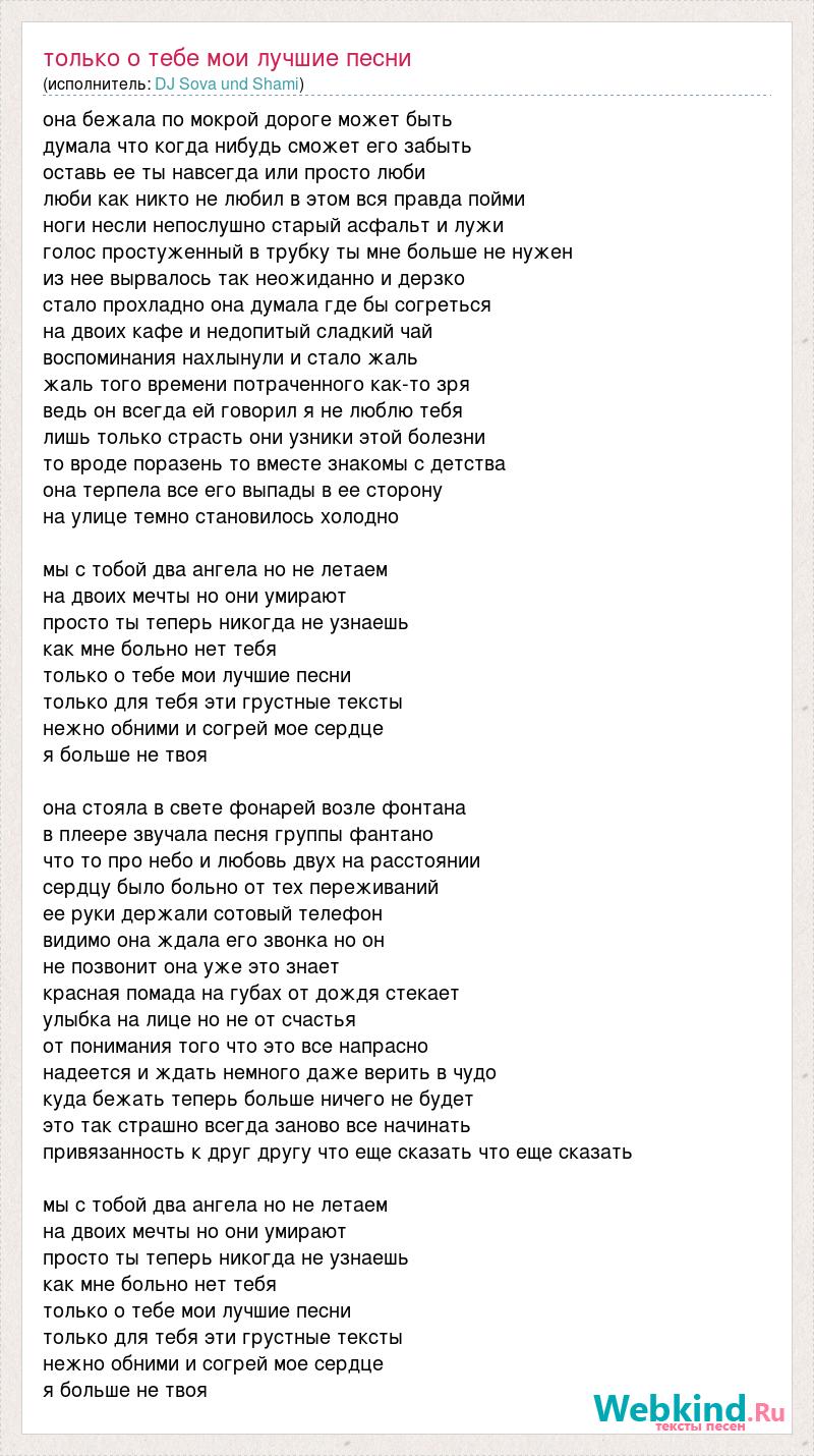 она бежала по мокрой дороге может быть думала что когда нибудь сможет его забыть оставь ее ты навсегда или просто люби люби как никто не любил в этом вся правда пойми ноги несли непослушно старый асфальт и лужи голос простуженный в трубку ты мне больше не нужен из нее вырвалось так неожиданно и дерзко стало прохладно она думала где бы согреться на двоих кафе и недопитый сладкий чай воспоминания нахлынули и стало жаль жаль того времени потраченного как-то зря ведь он всегда ей говорил я не люблю тебя лишь только страсть они узники этой болезни то вроде поразень то вместе знакомы с детства она терпела все его выпады в ее сторону на улице темно становилось холодно мы с тобой два ангела но не летаем на двоих мечты но они умирают просто ты теперь никогда не узнаешь как мне больно нет тебя только о тебе мои лучшие песни только для тебя эти грустные тексты нежно обними и согрей мое сердце я больше не твоя она стояла в свете фонарей возле фонтана в плеере звучала песня группы фантано что то про небо и любовь двух на расстоянии сердцу было больно от тех переживаний ее руки держали сотовый телефон видимо она ждала его звонка но он не позвонит она уже это знает красная помада на губах от дождя стекает улыбка на лице но не от счастья от понимания того что это все напрасно надеется и ждать немного даже верить в чудо куда бежать теперь больше ничего не будет это так страшно всегда заново все начинать привязанность к друг другу что еще сказать что еще сказать мы с тобой два ангела но не летаем на двоих мечты но они умирают просто ты теперь никогда не узнаешь как мне больно нет тебя только о тебе мои лучшие песни только для тебя эти грустные тексты нежно обними и согрей мое сердце я больше не твоя