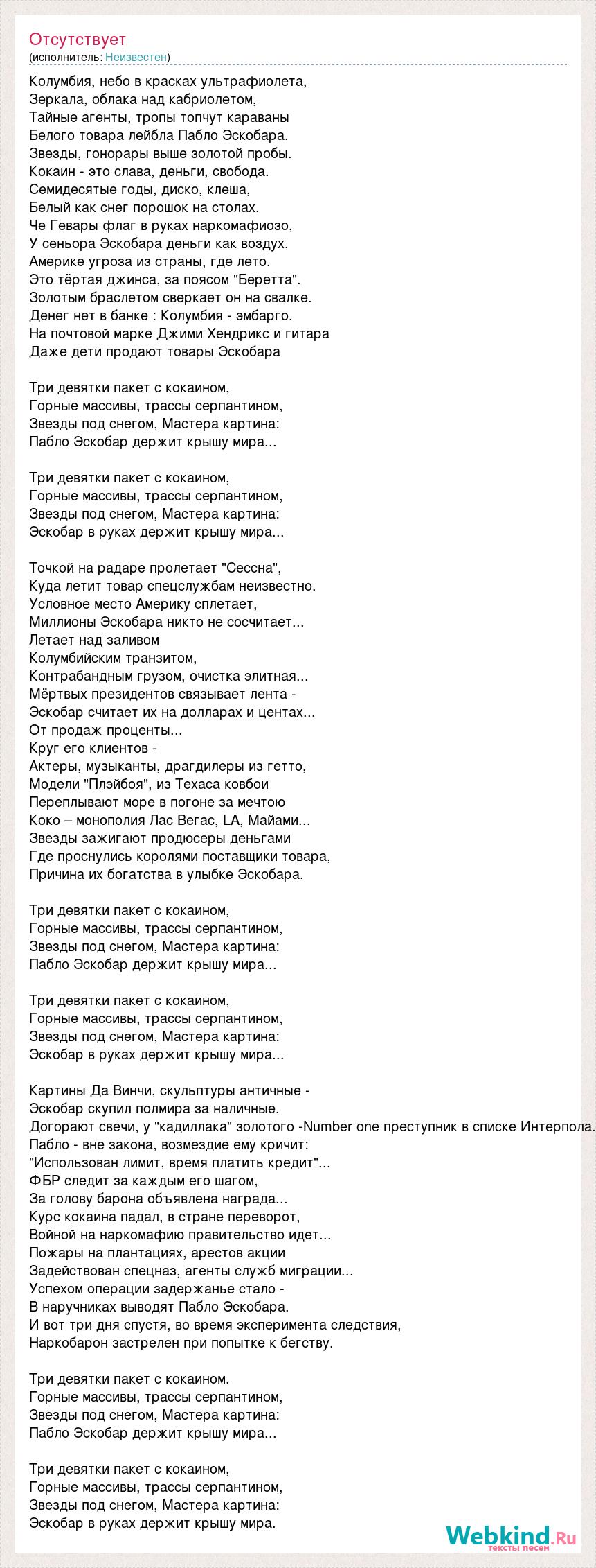 Колумбия, небо в красках ультрафиолета, Зеркала, облака над кабриолетом, Тайные агенты, тропы топчут караваны Белого товара лейбла Пабло Эскобара. Звезды, гонорары выше золотой пробы. Кокаин - это слава, деньги, свобода. Семидесятые годы, диско, клеша, Белый как снег порошок на столах. Че Гевары флаг в руках наркомафиозо, У сеньора Эскобара деньги как воздух. Америке угроза из страны, где лето. Это тёртая джинса, за поясом "Беретта". Золотым браслетом сверкает он на свалке. Денег нет в банке : Колумбия - эмбарго. На почтовой марке Джими Хендрикс и гитара Даже дети продают товары Эскобара Три девятки пакет с кокаином, Горные массивы, трассы серпантином, Звезды под снегом, Мастера картина: Пабло Эскобар держит крышу мира... Три девятки пакет с кокаином, Горные массивы, трассы серпантином, Звезды под снегом, Мастера картина: Эскобар в руках держит крышу мира... Точкой на радаре пролетает "Сессна", Куда летит товар спецслужбам неизвестно. Условное место Америку сплетает, Миллионы Эскобара никто не сосчитает... Летает над заливом Колумбийским транзитом, Контрабандным грузом, очистка элитная... Мёртвых президентов связывает лента - Эскобар считает их на долларах и центах... От продаж проценты... Круг его клиентов - Актеры, музыканты, драгдилеры из гетто, Модели "Плэйбоя", из Техаса ковбои Переплывают море в погоне за мечтою Коко – монополия Лас Вегас, LA, Майами... Звезды зажигают продюсеры деньгами Где проснулись королями поставщики товара, Причина их богатства в улыбке Эскобара. Три девятки пакет с кокаином, Горные массивы, трассы серпантином, Звезды под снегом, Мастера картина: Пабло Эскобар держит крышу мира... Три девятки пакет с кокаином, Горные массивы, трассы серпантином, Звезды под снегом, Мастера картина: Эскобар в руках держит крышу мира... Картины Да Винчи, скульптуры античные - Эскобар скупил полмира за наличные. Догорают свечи, у "кадиллака" золотого -Number one преступник в списке Интерпола. Пабло - вне закона, возмездие ему кричит: "Использован лимит, время платить кредит"... ФБР следит за каждым его шагом, За голову барона объявлена награда... Курс кокаина падал, в стране переворот, Войной на наркомафию правительство идет... Пожары на плантациях, арестов акции Задействован спецназ, агенты служб миграции... Успехом операции задержанье стало - В наручниках выводят Пабло Эскобара. И вот три дня спустя, во время эксперимента следствия, Наркобарон застрелен при попытке к бегству. Три девятки пакет с кокаином. Горные массивы, трассы серпантином, Звезды под снегом, Мастера картина: Пабло Эскобар держит крышу мира... Три девятки пакет с кокаином, Горные массивы, трассы серпантином, Звезды под снегом, Мастера картина: Эскобар в руках держит крышу мира.