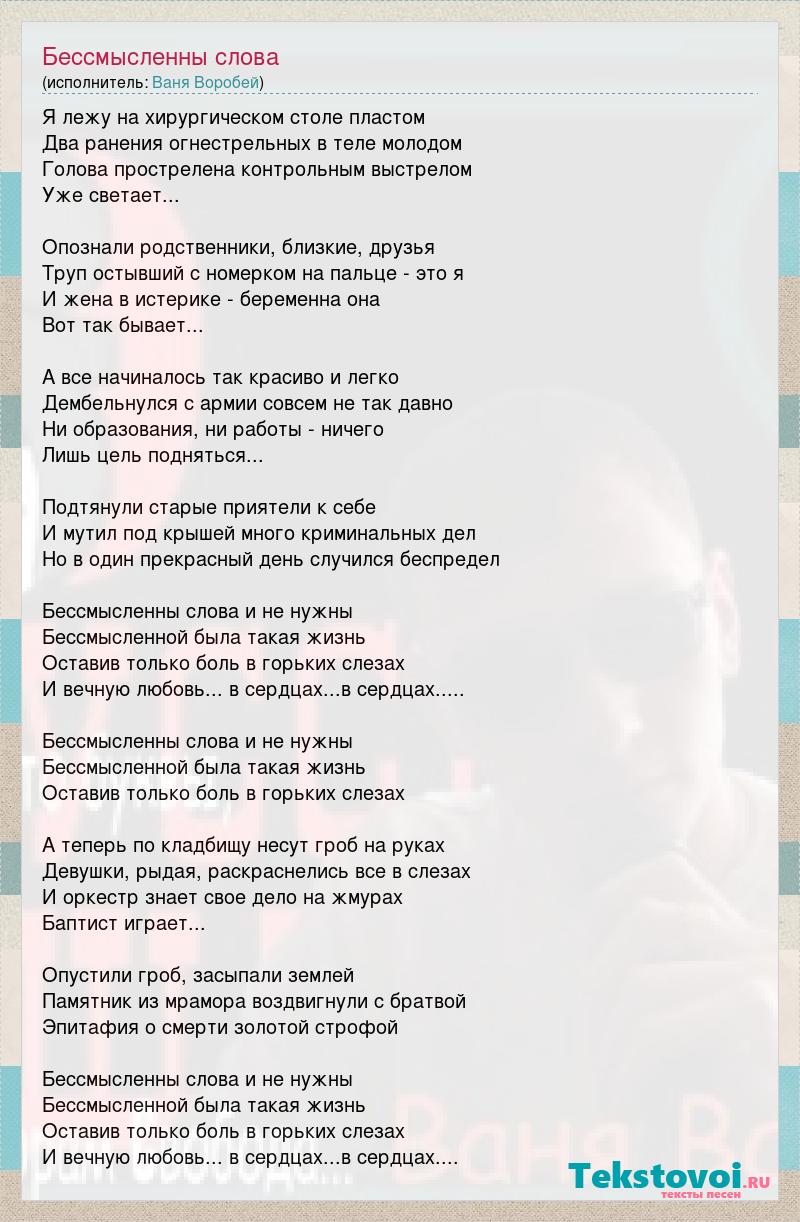 Я лежу на хирургическом столе пластом Два ранения огнестрельных в теле молодом Голова прострелена контрольным выстрелом Уже светает... Опознали родственники, близкие, друзья Труп остывший с номерком на пальце - это я И жена в истерике - беременна она Вот так бывает... А все начиналось так красиво и легко Дембельнулся с армии совсем не так давно Ни образования, ни работы - ничего Лишь цель подняться... Подтянули старые приятели к себе И мутил под крышей много криминальных дел Но в один прекрасный день случился беспредел Бессмысленны слова и не нужны Бессмысленной была такая жизнь Оставив только боль в горьких слезах И вечную любовь... в сердцах...в сердцах..... Бессмысленны слова и не нужны Бессмысленной была такая жизнь Оставив только боль в горьких слезах А теперь по кладбищу несут гроб на руках Девушки, рыдая, раскраснелись все в слезах И оркестр знает свое дело на жмурах Баптист играет... Опустили гроб, засыпали землей Памятник из мрамора воздвигнули с братвой Эпитафия о смерти золотой строфой Бессмысленны слова и не нужны Бессмысленной была такая жизнь Оставив только боль в горьких слезах И вечную любовь... в сердцах...в сердцах....