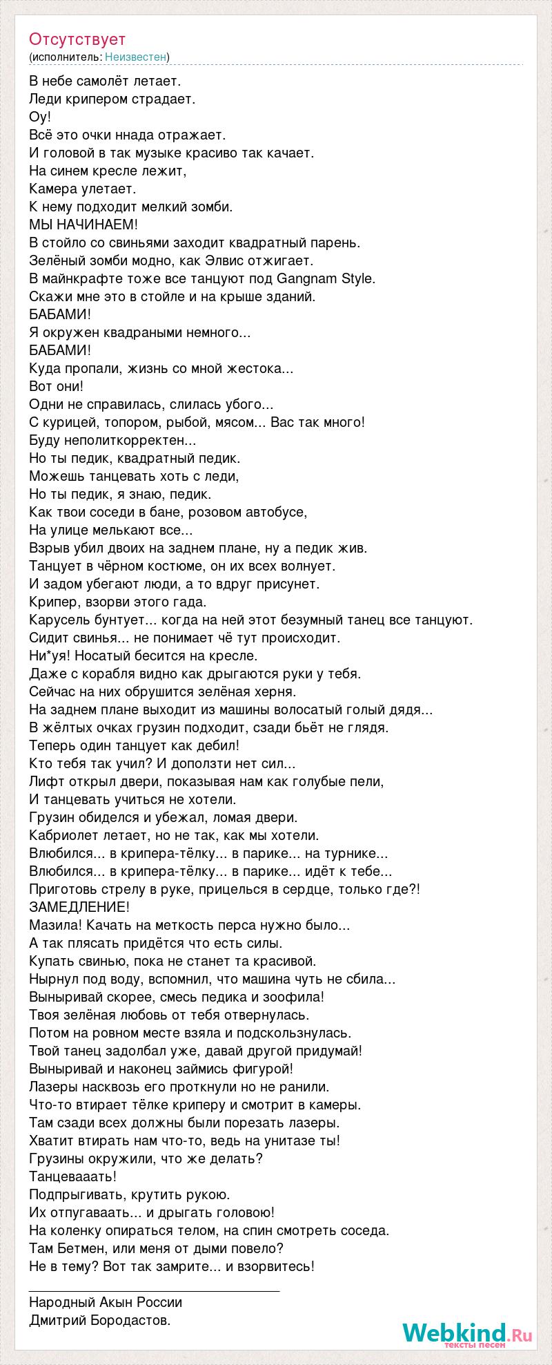 В небе самолёт летает. Леди крипером страдает. Оу! Всё это очки ннада отражает. И головой в так музыке красиво так качает. На синем кресле лежит, Камера улетает. К нему подходит мелкий зомби. МЫ НАЧИНАЕМ! В стойло со свиньями заходит квадратный парень. Зелёный зомби модно, как Элвис отжигает. В майнкрафте тоже все танцуют под Gangnam Style. Скажи мне это в стойле и на крыше зданий. БАБАМИ! Я окружен квадраными немного... БАБАМИ! Куда пропали, жизнь со мной жестока... Вот они! Одни не справилась, слилась убого... С курицей, топором, рыбой, мясом... Вас так много! Буду неполиткорректен... Но ты педик, квадратный педик. Можешь танцевать хоть с леди, Но ты педик, я знаю, педик. Как твои соседи в бане, розовом автобусе, На улице мелькают все... Взрыв убил двоих на заднем плане, ну а педик жив. Танцует в чёрном костюме, он их всех волнует. И задом убегают люди, а то вдруг присунет. Крипер, взорви этого гада. Карусель бунтует... когда на ней этот безумный танец все танцуют. Сидит свинья... не понимает чё тут происходит. Ни*уя! Носатый бесится на кресле. Даже с корабля видно как дрыгаются руки у тебя. Сейчас на них обрушится зелёная херня. На заднем плане выходит из машины волосатый голый дядя... В жёлтых очках грузин подходит, сзади бьёт не глядя. Теперь один танцует как дебил! Кто тебя так учил? И доползти нет сил... Лифт открыл двери, показывая нам как голубые пели, И танцевать учиться не хотели. Грузин обиделся и убежал, ломая двери. Кабриолет летает, но не так, как мы хотели. Влюбился... в крипера-тёлку... в парике... на турнике... Влюбился... в крипера-тёлку... в парике... идёт к тебе... Приготовь стрелу в руке, прицелься в сердце, только где?! ЗАМЕДЛЕНИЕ! Мазила! Качать на меткость перса нужно было... А так плясать придётся что есть силы. Купать свинью, пока не станет та красивой. Нырнул под воду, вспомнил, что машина чуть не сбила... Выныривай скорее, смесь педика и зоофила! Твоя зелёная любовь от тебя отвернулась. Потом на ровном месте взяла и подскользнулась. Твой танец задолбал уже, давай другой придумай! Выныривай и наконец займись фигурой! Лазеры насквозь его проткнули но не ранили. Что-то втирает тёлке криперу и смотрит в камеры. Там сзади всех должны были порезать лазеры. Хватит втирать нам что-то, ведь на унитазе ты! Грузины окружили, что же делать? Танцевааать! Подпрыгивать, крутить рукою. Их отпугаваать... и дрыгать головою! На коленку опираться телом, на спин смотреть соседа. Там Бетмен, или меня от дыми повело? Не в тему? Вот так замрите... и взорвитесь! _________________________________ Народный Акын России Дмитрий Бородастов.