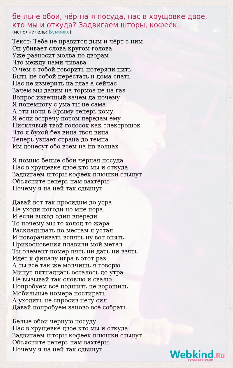 Текст: Тебе не нравится дым и чёрт с ним Он убивает слова кругом голова Уже разносит молва по дворам Что между нами чивава О чём с тобой говорить потеряли нить Быть не собой перестать и дома спать Нас не измерить на глаз а сейчас Зачем мы давим на тормоз не на газ Вопрос извечный зачем да почему Я понемногу с ума ты не сама А эти ночи в Крыму теперь кому Я если встречу потом передам ему Писклявый твой голосок как электрошок Что я бухой без вина твоя вина Теперь узнает страна до темна Им донесут обо всем на fm волнах Я помню белые обои чёрная посуда Нас в хрущёвке двое кто мы и откуда Задвигаем шторы кофеёк плюшки стынут Объясните теперь нам вахтёры Почему я на ней так сдвинут Давай вот так просидим до утра Не уходи погоди но мне пора И если выход один впереди То почему мы то холод то жара Раскладывать по местам я устал И поворачивать вспять ну вот опять Прикосновения плавили мой метал Ты элемент номер пять ни дать ни взять Идёт к финалу игра в этот раз А ты всё так же молчишь я говорю Минут пятнадцать осталось до утра Не вызывай так словлю и свалю Попробуем всё подшить не ворошить Мобильные номера постирать А уходить не спросив нету сил Давай попробуем заново всё собрать Белые обои чёрную посуду Нас в хрущёвке двое кто мы и откуда Задвигаем шторы кофеёк плюшки стынут Объясните теперь нам вахтёры Почему я на ней так сдвинут