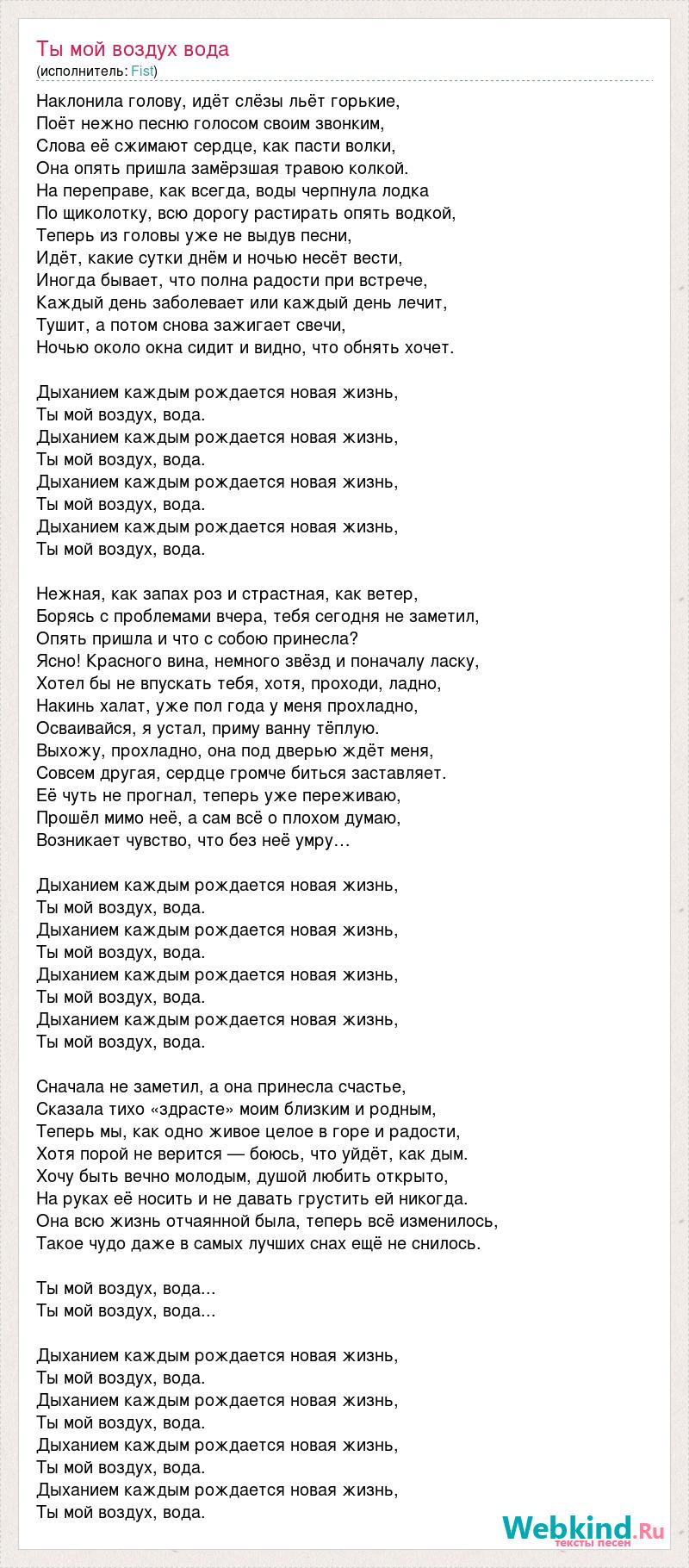 Наклонила голову, идёт слёзы льёт горькие, Поёт нежно песню голосом своим звонким, Слова её сжимают сердце, как пасти волки, Она опять пришла замёрзшая травою колкой. На переправе, как всегда, воды черпнула лодка По щиколотку, всю дорогу растирать опять водкой, Теперь из головы уже не выдув песни, Идёт, какие сутки днём и ночью несёт вести, Иногда бывает, что полна радости при встрече, Каждый день заболевает или каждый день лечит, Тушит, а потом снова зажигает свечи, Ночью около окна сидит и видно, что обнять хочет. Дыханием каждым рождается новая жизнь, Ты мой воздух, вода. Дыханием каждым рождается новая жизнь, Ты мой воздух, вода. Дыханием каждым рождается новая жизнь, Ты мой воздух, вода. Дыханием каждым рождается новая жизнь, Ты мой воздух, вода. Нежная, как запах роз и страстная, как ветер, Борясь с проблемами вчера, тебя сегодня не заметил, Опять пришла и что с собою принесла? Ясно! Красного вина, немного звёзд и поначалу ласку, Хотел бы не впускать тебя, хотя, проходи, ладно, Накинь халат, уже пол года у меня прохладно, Осваивайся, я устал, приму ванну тёплую. Выхожу, прохладно, она под дверью ждёт меня, Совсем другая, сердце громче биться заставляет. Её чуть не прогнал, теперь уже переживаю, Прошёл мимо неё, а сам всё о плохом думаю, Возникает чувство, что без неё умру… Дыханием каждым рождается новая жизнь, Ты мой воздух, вода. Дыханием каждым рождается новая жизнь, Ты мой воздух, вода. Дыханием каждым рождается новая жизнь, Ты мой воздух, вода. Дыханием каждым рождается новая жизнь, Ты мой воздух, вода. Сначала не заметил, а она принесла счастье, Сказала тихо «здрасте» моим близким и родным, Теперь мы, как одно живое целое в горе и радости, Хотя порой не верится — боюсь, что уйдёт, как дым. Хочу быть вечно молодым, душой любить открыто, На руках её носить и не давать грустить ей никогда. Она всю жизнь отчаянной была, теперь всё изменилось, Такое чудо даже в самых лучших снах ещё не снилось. Ты мой воздух, вода... Ты мой воздух, вода... Дыханием каждым рождается новая жизнь, Ты мой воздух, вода. Дыханием каждым рождается новая жизнь, Ты мой воздух, вода. Дыханием каждым рождается новая жизнь, Ты мой воздух, вода. Дыханием каждым рождается новая жизнь, Ты мой воздух, вода.
