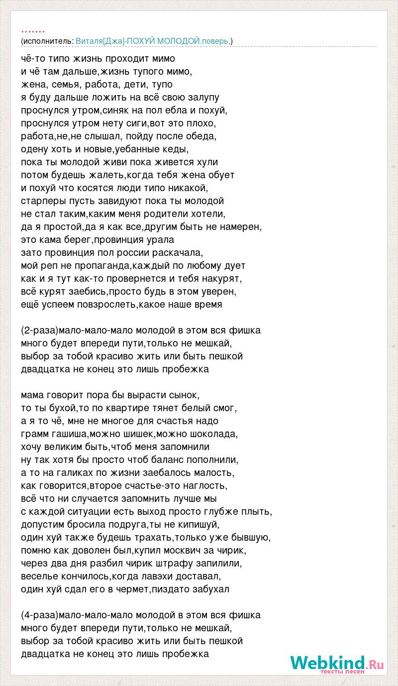 чё-то типо жизнь проходит мимо и чё там дальше,жизнь тупого мимо, жена, семья, работа, дети, тупо я буду дальше ложить на всё свою залупу проснулся утром,синяк на пол ебла и похуй, проснулся утром нету сиги,вот это плохо, работа,не,не слышал, пойду после обеда, одену хоть и новые,уебанные кеды, пока ты молодой живи пока живется хули потом будешь жалеть,когда тебя жена обует и похуй что косятся люди типо никакой, старперы пусть завидуют пока ты молодой не стал таким,каким меня родители хотели, да я простой,да я как все,другим быть не намерен, это кама берег,провинция урала зато провинция пол россии раскачала, мой реп не пропаганда,каждый по любому дует как и я тут как-то провернется и тебя накурят, всё курят заебись,просто будь в этом уверен, ещё успеем повзрослеть,какое наше время (2-раза)мало-мало-мало молодой в этом вся фишка много будет впереди пути,только не мешкай, выбор за тобой красиво жить или быть пешкой двадцатка не конец это лишь пробежка мама говорит пора бы вырасти сынок, то ты бухой,то по квартире тянет белый смог, а я то чё, мне не многое для счастья надо грамм гашиша,можно шишек,можно шоколада, хочу великим быть,чтоб меня запомнили ну так хотя бы просто чтоб баланс пополнили, а то на галиках по жизни заебалось малость, как говорится,второе счастье-это наглость, всё что ни случается запомнить лучше мы с каждой ситуации есть выход просто глубже плыть, допустим бросила подруга,ты не кипишуй, один хуй также будешь трахать,только уже бывшую, помню как доволен был,купил москвич за чирик, через два дня разбил чирик штрафу запилили, веселье кончилось,когда лавэхи доставал, один хуй сдал его в чермет,пиздато забухал (4-раза)мало-мало-мало молодой в этом вся фишка много будет впереди пути,только не мешкай, выбор за тобой красиво жить или быть пешкой двадцатка не конец это лишь пробежка