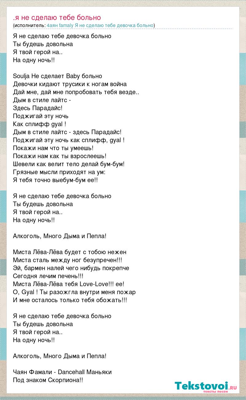 Я не сделаю тебе девочка больно Ты будешь довольна Я твой герой на.. На одну ночь!! Soulja Не сделает Baby больно Девочки кидают трусики к ногам война Дай мне, дай мне попробовать тебя везде.. Дым в стиле лайтс - Здесь Парадайс! Поджигай эту ночь Как сплифф gyal ! Дым в стиле лайтс - здесь Парадайс! Поджигай эту ночь как сплифф, gyal ! Покажи нам что ты умеешь! Покажи нам как ты взрослеешь! Шевели как велит тело делай бум-бум! Грязные мысли приходят на ум: Я тебя точно выебум-бум ее!! Я не сделаю тебе девочка больно Ты будешь довольна Я твой герой на.. На одну ночь!! Алкоголь, Много Дыма и Пепла! Миста Лёва-Лёва будет с тобою нежен Миста сталь между ног безупречен!!! Эй, бармен налей чего нибудь покрепче Сегодня лечим печень!!! Миста Лёва-Лёва тебя Love-Love!!! ее! O, Gyal ! Ты разожгла внутри меня пожар И мне осталось только тебя обожать!!! Я не сделаю тебе девочка больно Ты будешь довольна Я твой герой на.. На одну ночь!! Алкоголь, Много Дыма и Пепла! Чаян Фамали - Dancehall Маньяки Под знаком Скорпиона!!