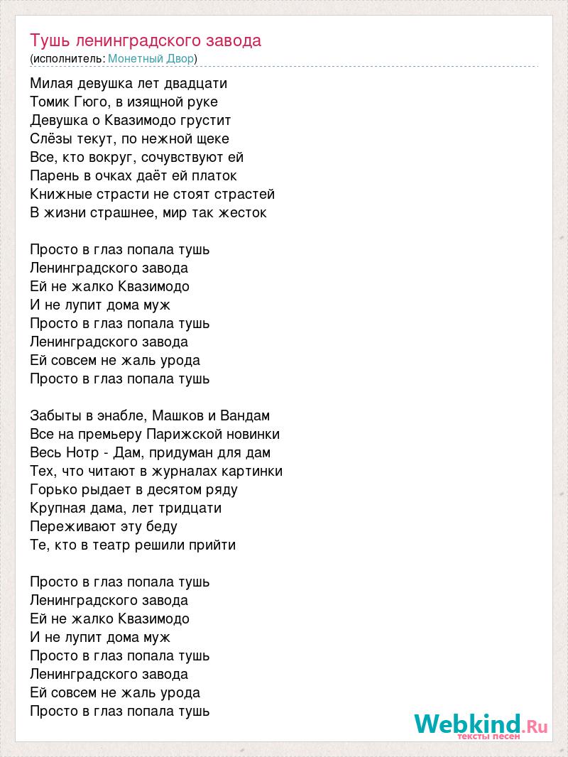 Милая девушка лет двадцати Томик Гюго, в изящной руке Девушка о Квазимодо грустит Слёзы текут, по нежной щеке Все, кто вокруг, сочувствуют ей Парень в очках даёт ей платок Книжные страсти не стоят страстей В жизни страшнее, мир так жесток Просто в глаз попала тушь Ленинградского завода Ей не жалко Квазимодо И не лупит дома муж Просто в глаз попала тушь Ленинградского завода Ей совсем не жаль урода Просто в глаз попала тушь Забыты в энабле, Машков и Вандам Все на премьеру Парижской новинки Весь Нотр - Дам, придуман для дам Тех, что читают в журналах картинки Горько рыдает в десятом ряду Крупная дама, лет тридцати Переживают эту беду Те, кто в театр решили прийти Просто в глаз попала тушь Ленинградского завода Ей не жалко Квазимодо И не лупит дома муж Просто в глаз попала тушь Ленинградского завода Ей совсем не жаль урода Просто в глаз попала тушь