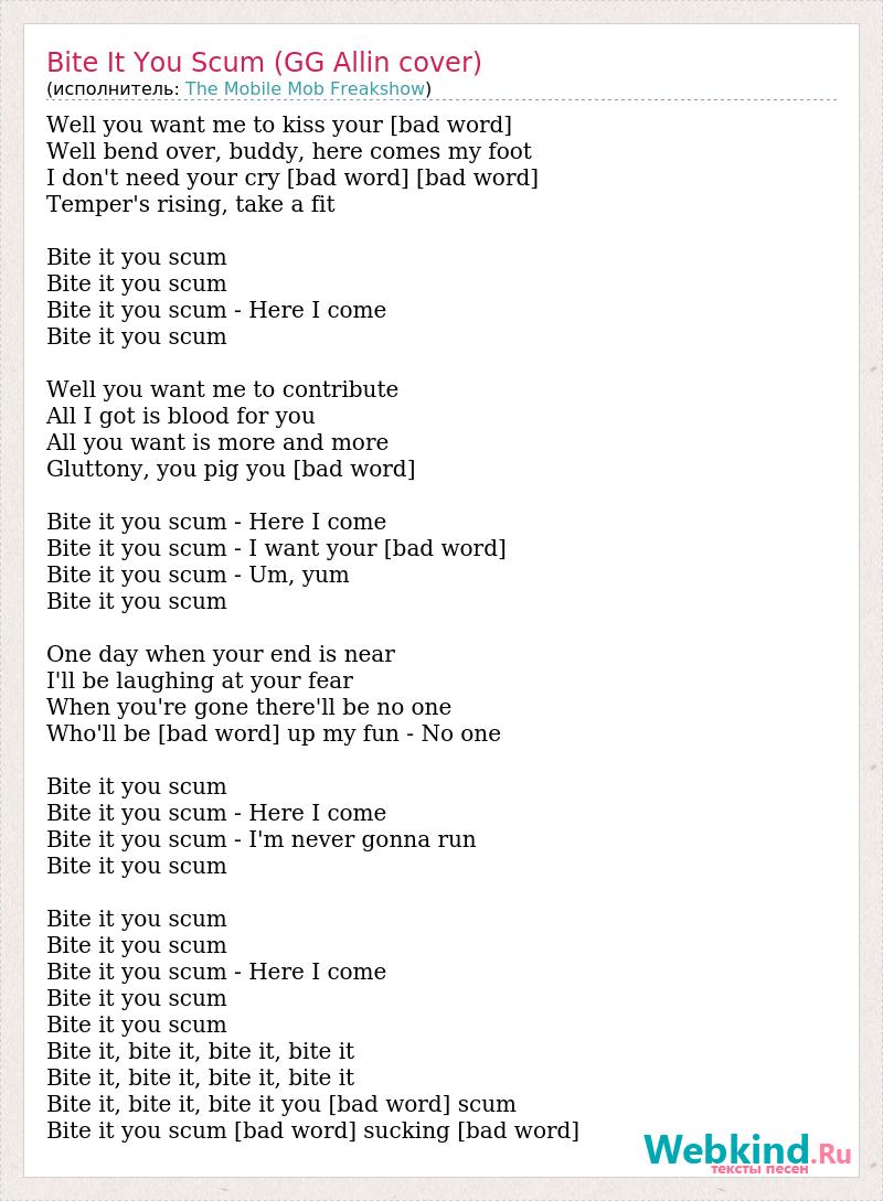 А как ты думаешь, о чем песня "Bite It You Scum (GG Allin cover)" ?