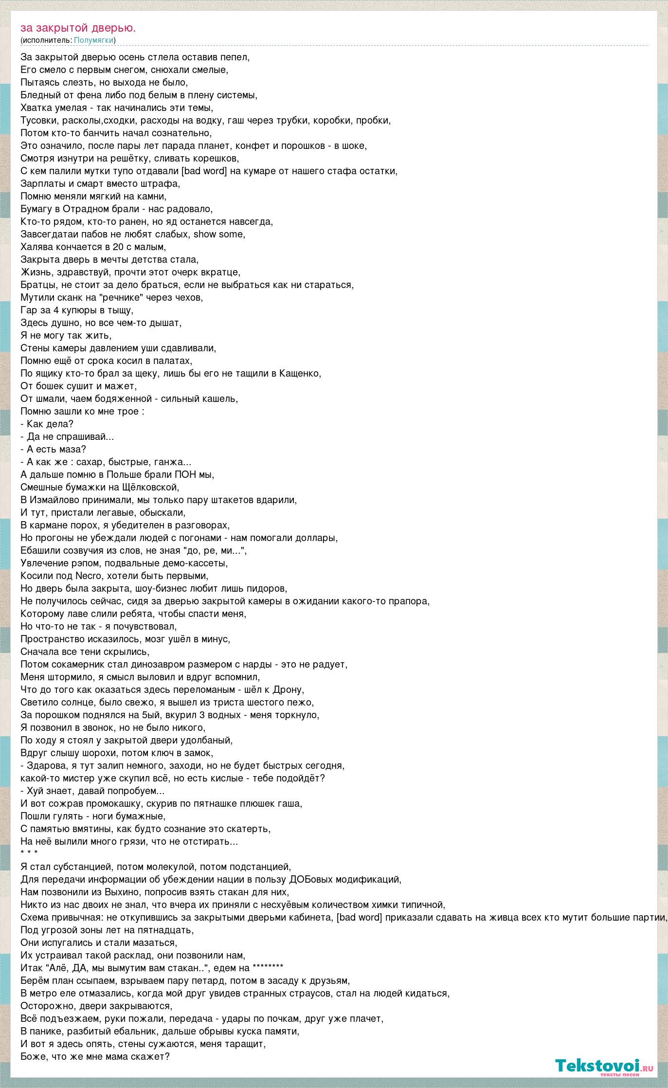 За закрытой дверью осень стлела оставив пепел, Его смело с первым снегом, снюхали смелые, Пытаясь слезть, но выхода не было, Бледный от фена либо под белым в плену системы, Хватка умелая - так начинались эти темы, Тусовки, расколы,сходки, расходы на водку, гаш через трубки, коробки, пробки, Потом кто-то банчить начал сознательно, Это означило, после пары лет парада планет, конфет и порошков - в шоке, Смотря изнутри на решётку, сливать корешков, С кем палили мутки тупо отдавали [bad word] на кумаре от нашего стафа остатки, Зарплаты и смарт вместо штрафа, Помню меняли мягкий на камни, Бумагу в Отрадном брали - нас радовало, Кто-то рядом, кто-то ранен, но яд останется навсегда, Завсегдатаи пабов не любят слабых, show some, Халява кончается в 20 с малым, Закрыта дверь в мечты детства стала, Жизнь, здравствуй, прочти этот очерк вкратце, Братцы, не стоит за дело браться, если не выбраться как ни стараться, Мутили сканк на "речнике" через чехов, Гар за 4 купюры в тыщу, Здесь душно, но все чем-то дышат, Я не могу так жить, Стены камеры давлением уши сдавливали, Помню ещё от срока косил в палатах, По ящику кто-то брал за щеку, лишь бы его не тащили в Кащенко, От бошек сушит и мажет, От шмали, чаем бодяженной - сильный кашель, Помню зашли ко мне трое : - Как дела? - Да не спрашивай... - А есть маза? - А как же : сахар, быстрые, ганжа... А дальше помню в Польше брали ПОН мы, Смешные бумажки на Щёлковской, В Измайлово принимали, мы только пару штакетов вдарили, И тут, пристали легавые, обыскали, В кармане порох, я убедителен в разговорах, Но прогоны не убеждали людей c погонами - нам помогали доллары, Ебашили созвучия из слов, не зная "до, ре, ми...", Увлечение рэпом, подвальные демо-кассеты, Косили под Necro, хотели быть первыми, Но дверь была закрыта, шоу-бизнес любит лишь пидоров, Не получилось сейчас, сидя за дверью закрытой камеры в ожидании какого-то прапора, Которому лаве слили ребята, чтобы спасти меня, Но что-то не так - я почувствовал, Пространство исказилось, мозг ушёл в минус, Сначала все тени скрылись, Потом сокамерник стал динозавром размером с нарды - это не радует, Меня штормило, я смысл выловил и вдруг вспомнил, Что до того как оказаться здесь переломаным - шёл к Дрону, Светило солнце, было свежо, я вышел из триста шестого пежо, За порошком поднялся на 5ый, вкурил 3 водных - меня торкнуло, Я позвонил в звонок, но не было никого, По ходу я стоял у закрытой двери удолбаный, Вдруг слышу шорохи, потом ключ в замок, - Здарова, я тут залип немного, заходи, но не будет быстрых сегодня, какой-то мистер уже скупил всё, но есть кислые - тебе подойдёт? - Хуй знает, давай попробуем... И вот сожрав промокашку, скурив по пятнашке плюшек гаша, Пошли гулять - ноги бумажные, С памятью вмятины, как будто сознание это скатерть, На неё вылили много грязи, что не отстирать... * * * Я стал субстанцией, потом молекулой, потом подстанцией, Для передачи информации об убеждении нации в пользу ДОБовых модификаций, Нам позвонили из Выхино, попросив взять стакан для них, Никто из нас двоих не знал, что вчера их приняли с несхуёвым количеством химки типичной, Схема привычная: не откупившись за закрытыми дверьми кабинета, [bad word] приказали сдавать на живца всех кто мутит большие партии, Под угрозой зоны лет на пятнадцать, Они испугались и стали мазаться, Их устраивал такой расклад, они позвонили нам, Итак "Алё, ДА, мы вымутим вам стакан..", едем на *