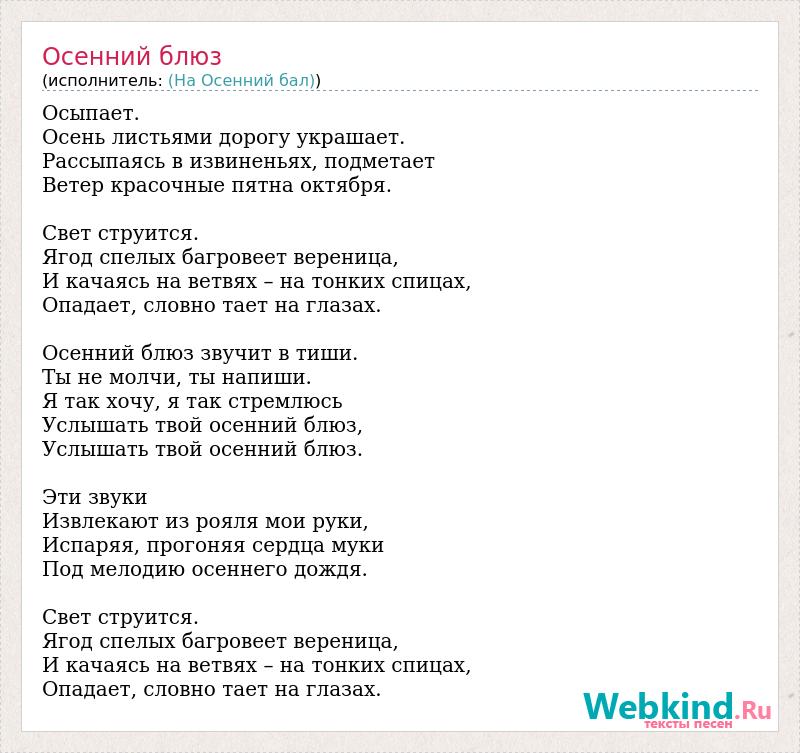 Осыпает. Осень листьями дорогу украшает. Рассыпаясь в извиненьях, подметает Ветер красочные пятна октября. Свет струится. Ягод спелых багровеет вереница, И качаясь на ветвях – на тонких спицах, Опадает, словно тает на глазах. Осенний блюз звучит в тиши. Ты не молчи, ты напиши. Я так хочу, я так стремлюсь Услышать твой осенний блюз, Услышать твой осенний блюз. Эти звуки Извлекают из рояля мои руки, Испаряя, прогоняя сердца муки Под мелодию осеннего дождя. Свет струится. Ягод спелых багровеет вереница, И качаясь на ветвях – на тонких спицах, Опадает, словно тает на глазах.
