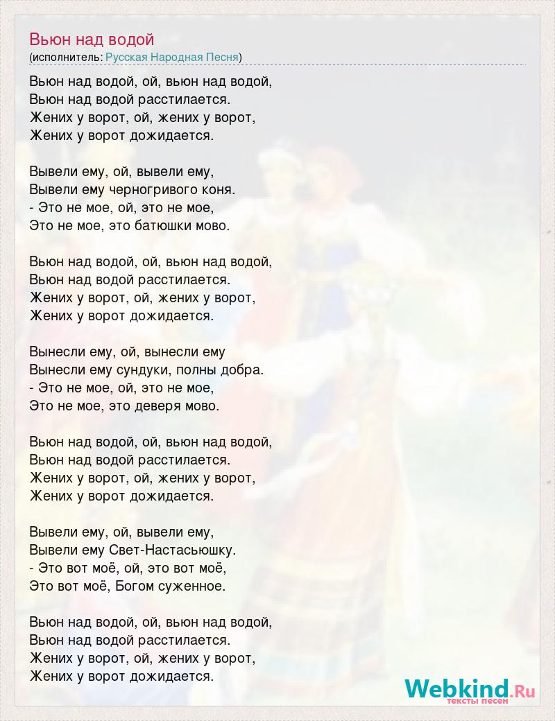 Вьюн над водой, ой, вьюн над водой, Вьюн над водой расстилается. Жених у ворот, ой, жених у ворот, Жених у ворот дожидается. Вывели ему, ой, вывели ему, Вывели ему черногривого коня. - Это не мое, ой, это не мое, Это не мое, это батюшки мово. Вьюн над водой, ой, вьюн над водой, Вьюн над водой расстилается. Жених у ворот, ой, жених у ворот, Жених у ворот дожидается. Вынесли ему, ой, вынесли ему Вынесли ему сундуки, полны добра. - Это не мое, ой, это не мое, Это не мое, это деверя мово. Вьюн над водой, ой, вьюн над водой, Вьюн над водой расстилается. Жених у ворот, ой, жених у ворот, Жених у ворот дожидается. Вывели ему, ой, вывели ему, Вывели ему Свет-Настасьюшку. - Это вот моё, ой, это вот моё, Это вот моё, Богом суженное. Вьюн над водой, ой, вьюн над водой, Вьюн над водой расстилается. Жених у ворот, ой, жених у ворот, Жених у ворот дожидается.