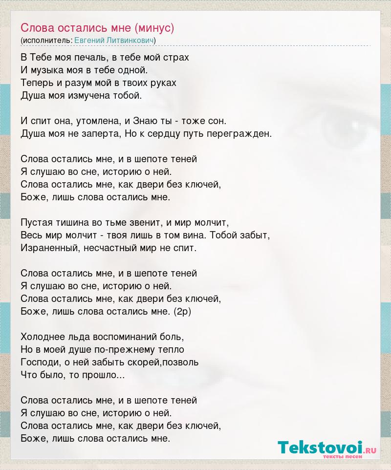 В Тебе моя печаль, в тебе мой страх И музыка моя в тебе одной. Теперь и разум мой в твоих руках Душа моя измучена тобой. И спит она, утомлена, и Знаю ты - тоже сон. Душа моя не заперта, Но к сердцу путь перегражден. Слова остались мне, и в шепоте теней Я слушаю во сне, историю о ней. Слова остались мне, как двери без ключей, Боже, лишь слова остались мне. Пустая тишина во тьме звенит, и мир молчит, Весь мир молчит - твоя лишь в том вина. Тобой забыт, Израненный, несчастный мир не спит. Слова остались мне, и в шепоте теней Я слушаю во сне, историю о ней. Слова остались мне, как двери без ключей, Боже, лишь слова остались мне. (2р) Холоднее льда воспоминаний боль, Но в моей душе по-прежнему тепло Господи, о ней забыть скорей,позволь Что было, то прошло... Слова остались мне, и в шепоте теней Я слушаю во сне, историю о ней. Слова остались мне, как двери без ключей, Боже, лишь слова остались мне.