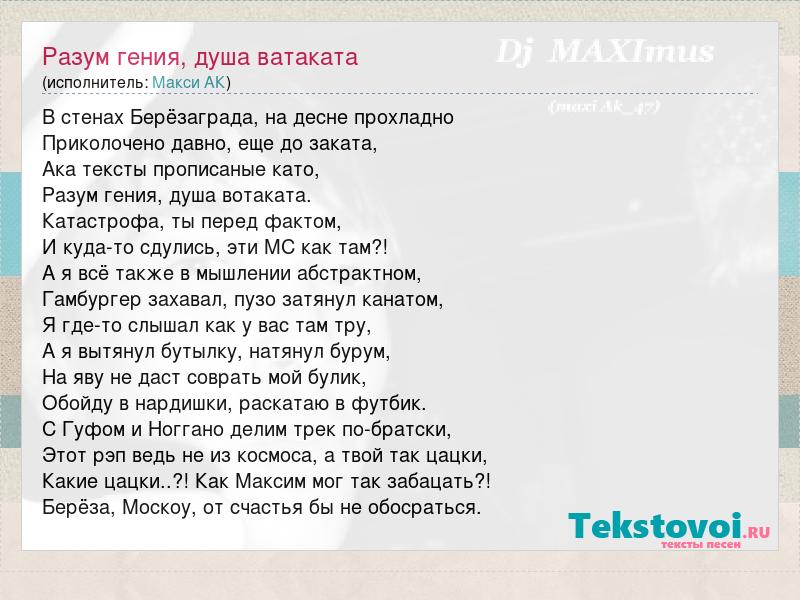 В стенах Берёзаграда, на десне прохладно Приколочено давно, еще до заката, Ака тексты прописаные като, Разум гения, душа вотаката. Катастрофа, ты перед фактом, И куда-то сдулись, эти MC как там?! А я всё также в мышлении абстрактном, Гамбургер захавал, пузо затянул канатом, Я где-то слышал как у вас там тру, А я вытянул бутылку, натянул бурум, На яву не даст соврать мой булик, Обойду в нардишки, раскатаю в футбик. С Гуфом и Ноггано делим трек по-братски, Этот рэп ведь не из космоса, а твой так цацки, Какие цацки..?! Как Максим мог так забацать?! Берёза, Москоу, от счастья бы не обосраться.
