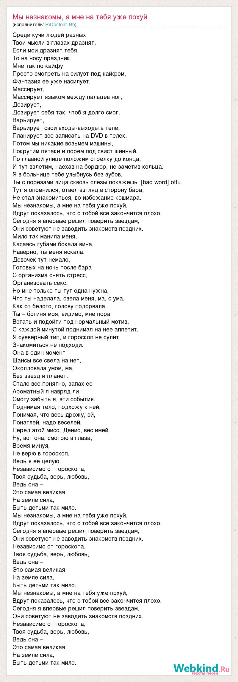 Среди кучи людей разных Твои мысли в глазах дразнят, Если мои дразнят тебя, То на носу праздник. Мне так по кайфу Просто смотреть на силуэт под кайфом, Фантазия ее уже насилует. Массирует, Массирует языком между пальцев ног, Дозирует, Дозирует себя так, чтоб я долго смог. Варьирует, Варьирует свои входы-выходы в теле, Планирует все записать на DVD в телек. Потом мы никакие возьмем машины, Покрутим пятаки и порем под свист шинный, По главной улице положим стрелку до конца, И тут взлетим, наехав на бордюр, не заметив кольца. Я в больнице тебе улыбнусь без зубов, Ты с порезами лица сквозь слезы покажешь [bad word] off». Тут я опомнился, отвел взгляд в сторону бара, Не стал знакомиться, во избежание кошмара. Мы незнакомы, а мне на тебя уже похуй, Вдруг показалось, что с тобой все закончится плохо. Сегодня я впервые решил поверить звездам, Они советуют не заводить знакомств поздних. Мило так манила меня, Касаясь губами бокала вина, Наверно, ты меня искала. Девочек тут немало, Готовых на ночь после бара С организма снять стресс, Организовать секс. Но мне только ты тут одна нужна, Что ты наделала, свела меня, ма, с ума, Как от белого, голову подорвала, Ты – богиня моя, видимо, мне пора Встать и подойти под нормальный мотив, С каждой минутой поднимая на нее аппетит, Я суеверный тип, и гороскоп не сулит, Знакомиться не подходи. Она в один момент Шансы все свела на нет, Околдовала умом, ма, Без звезд и планет. Стало все понятно, запах ее Ароматный я навряд ли Смогу забыть я, эти события. Поднимая тело, подхожу к ней, Понимая, что весь дрожу, эй, Понаглей, надо веселей, Перед этой мисс, Денис, вес имей. Ну, вот она, смотрю в глаза, Время минуя, Не верю в гороскоп, Ведь я ее целую. Независимо от гороскопа, Твоя судьба, верь, любовь, Ведь она – Это самая великая На земле сила, Быть детьми так мило. Мы незнакомы, а мне на тебя уже похуй, Вдруг показалось, что с тобой все закончится плохо. Сегодня я впервые решил поверить звездам, Они советуют не заводить знакомств поздних. Независимо от гороскопа, Твоя судьба, верь, любовь, Ведь она – Это самая великая На земле сила, Быть детьми так мило. Мы незнакомы, а мне на тебя уже похуй, Вдруг показалось, что с тобой все закончится плохо. Сегодня я впервые решил поверить звездам, Они советуют не заводить знакомств поздних. Независимо от гороскопа, Твоя судьба, верь, любовь, Ведь она – Это самая великая На земле сила, Быть детьми так мило.