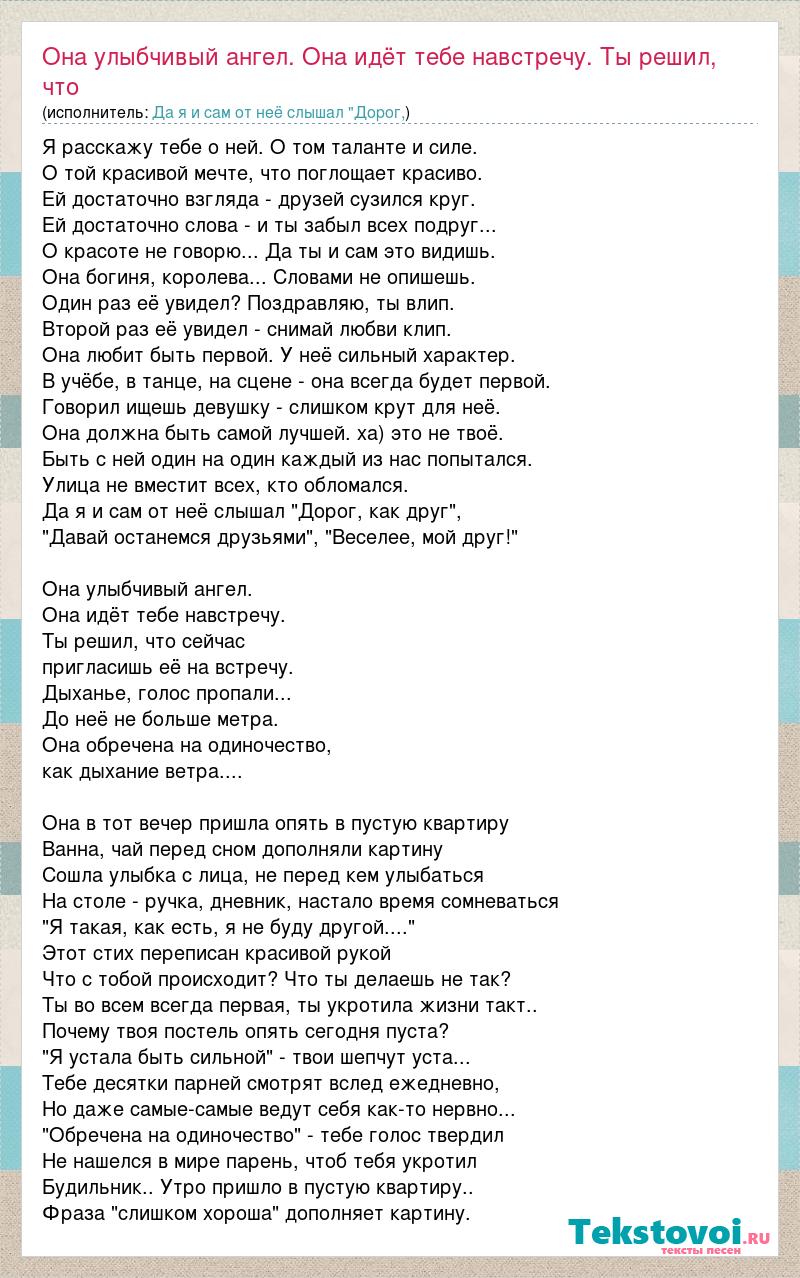 Главная→Исполнители→Да я и сам от неё слышал "Дорог, как друг", "Давай останемся друзьями", "Веселее, мой друг!"→Она улыбчивый ангел. Она идёт тебе навстречу. Ты решил, что сейчас пригласишь её