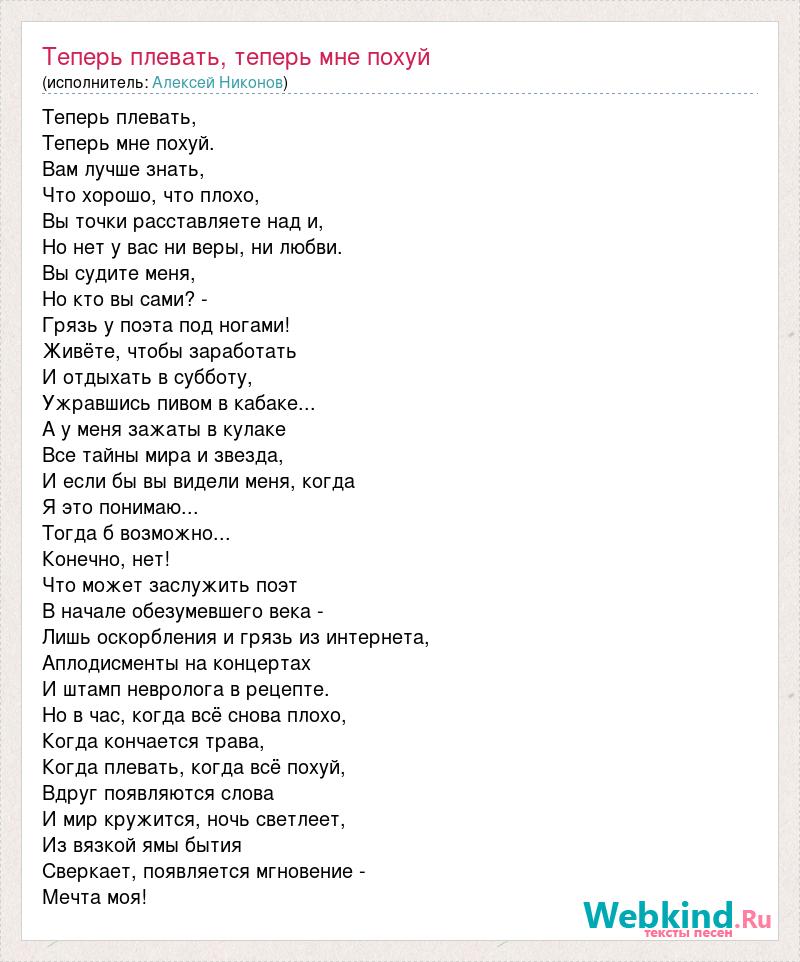 Теперь плевать, Теперь мне похуй. Вам лучше знать, Что хорошо, что плохо, Вы точки расставляете над и, Но нет у вас ни веры, ни любви. Вы судите меня, Но кто вы сами? - Грязь у поэта под ногами! Живёте, чтобы заработать И отдыхать в субботу, Ужравшись пивом в кабаке... А у меня зажаты в кулаке Все тайны мира и звезда, И если бы вы видели меня, когда Я это понимаю... Тогда б возможно... Конечно, нет! Что может заслужить поэт В начале обезумевшего века - Лишь оскорбления и грязь из интернета, Аплодисменты на концертах И штамп невролога в рецепте. Но в час, когда всё снова плохо, Когда кончается трава, Когда плевать, когда всё похуй, Вдруг появляются слова И мир кружится, ночь светлеет, Из вязкой ямы бытия Сверкает, появляется мгновение - Мечта моя!
