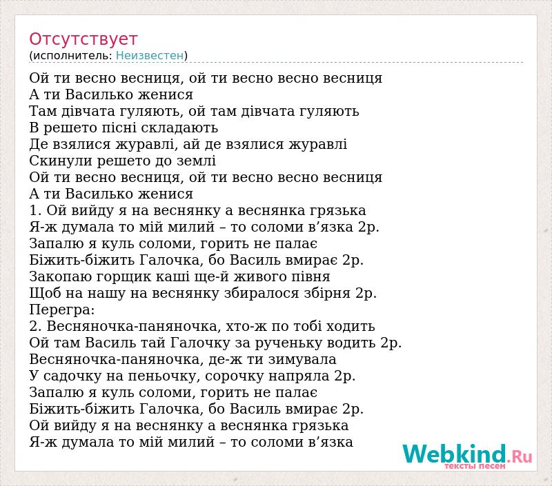 Ой ти весно весниця, ой ти весно весно весниця А ти Василько женися Там дівчата гуляють, ой там дівчата гуляють В решето пісні складають Де взялися журавлі, ай де взялися журавлі Скинули решето до землі Ой ти весно весниця, ой ти весно весно весниця А ти Василько женися 1. Ой вийду я на веснянку а веснянка грязька Я-ж думала то мій милий – то соломи в’язка 2р. Запалю я куль соломи, горить не палає Біжить-біжить Галочка, бо Василь вмирає 2р. Закопаю горщик каші ще-й живого півня Щоб на нашу на веснянку збиралося збірня 2р. Перегра: 2. Весняночка-паняночка, хто-ж по тобі ходить Ой там Василь тай Галочку за рученьку водить 2р. Весняночка-паняночка, де-ж ти зимувала У садочку на пеньочку, сорочку напряла 2р. Запалю я куль соломи, горить не палає Біжить-біжить Галочка, бо Василь вмирає 2р. Ой вийду я на веснянку а веснянка грязька Я-ж думала то мій милий – то соломи в’язка