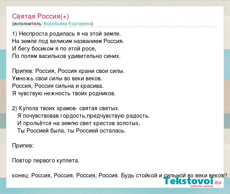 1) Неспроста родилась я на этой земле. На земле под великим названием Россия. И бегу босиком я по этой росе, По полям васильков удивительно синих. Припев: Россия, Россия храни свои силы. Умножь свои силы во веки веков. Россия, Россия сильна и красива. Я чувствую нежность твоих родников. 2) Купола твоих храмов- святая святых. Я почувствовав гордость,предчувствую радость. И прольётся на землю свет крестов золотых. Ты Россией была, ты Россией осталась. Припев: Повтор первого куплета. конец: Россия, Россия. Россия, Россия. Будь стойкой и сильной во веки веков!!
