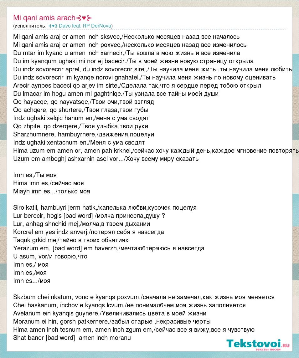 Mi qani amis araj er amen inch sksvec,/Несколько месяцев назад все началось Mi qani amis araj er amen inch poxvec,/несколько месяцев назад все изменилось Du mtar im kyanq u amen inch xarnecir,/Ты вошла в мою жизнь и все изменила Du im kyanqum ughaki mi nor ej bacecir./Ты в моей жизни новую страницу открыла Du indz sovorecrir aprel, du indz sovorecrir sirel,/Ты научила меня жить ,ты научила меня любить Du indz sovorecrir im kyanqe norovi gnahatel./Ты научила меня жизнь по новому оценивать Arecir aynpes baceci qo arjev im sirte,/Сделала так,что я сердце перед тобою открыл Du imacar im hogu amen mi gaghtniqe./Ты узнала все тайны моей души Qo hayacqe, qo nayvatsqe,/Твои очи,твой взгляд Qo achqere, qo shurtere,/Твои глаза,твои губы Indz ughaki xelqic hanum en,/меня с ума сводят Qo zhpite, qo dzerqere,/Твоя улыбка,твои руки Sharzhumnere, hambuyrnere,/движения,поцелуи Indz ughaki xentacnum en./Меня с ума сводят Hima uzum em amen or, amen pah krknel,/сейчас хочу каждый день,каждое мгновение повторять Uzum em amboghj ashxarhin asel vor.../Хочу всему миру сказать Imn es,/Ты моя Hima imn es,/сейчас моя Miayn imn es.../только моя Siro katil, hambuyri jerm hatik,/капелька любви,кусочек поцелуя Lur berecir, hogis parurecir,/молча принесла,душу ? Lur, anhag shnchid mej,/молча,в твоем дыхании Korcrel em yes indz anverj,/потерял себя я навсегда Taquk grkid mej/тайно в твоих обьятиях Yerazum em, chaxrum em haverzh,/мечтаю6теряюсь я навсегда U asum, vor/и говорю,что Imn es,/ моя Imn es,/моя Imn es.../моя Skzbum chei nkatum, vonc e kyanqs poxvum,/сначала не замечал,как жизнь моя меняется Chei haskanum, inchov e kyanqs lcvum,/не понимал6чем моя жизнь заполняется Avelanum ein kyanqis guynere,/Увеличивались цвета в моей жизни Moranum ei hin, gorsh patkernere./забыл старые ,некрасивые черты Hima amen inch tesnum em, amen inch zgum em,/сейчас все я вижу,все я чувствую Shat baner nerum, amen inch moranu