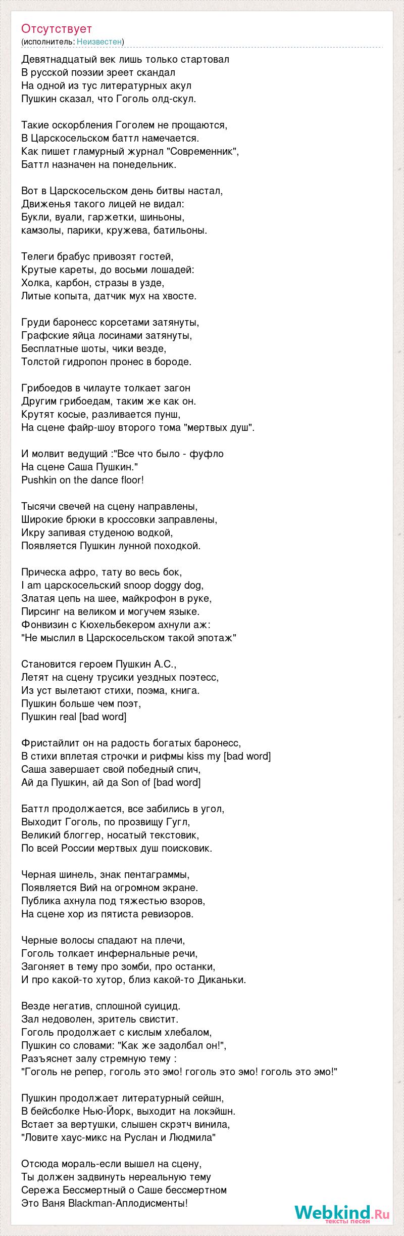 Девятнадцатый век лишь только стартовал В русской поэзии зреет скандал На одной из тус литературных акул Пушкин сказал, что Гоголь олд-скул. Такие оскорбления Гоголем не прощаются, В Царскосельском баттл намечается. Как пишет гламурный журнал "Современник", Баттл назначен на понедельник. Вот в Царскосельском день битвы настал, Движенья такого лицей не видал: Букли, вуали, гаржетки, шиньоны, камзолы, парики, кружева, батильоны. Телеги брабус привозят гостей, Крутые кареты, до восьми лошадей: Холка, карбон, стразы в узде, Литые копыта, датчик мух на хвосте. Груди баронесс корсетами затянуты, Графские яйца лосинами затянуты, Бесплатные шоты, чики везде, Толстой гидропон пронес в бороде. Грибоедов в чилауте толкает загон Другим грибоедам, таким же как он. Крутят косые, разливается пунш, На сцене файр-шоу второго тома "мертвых душ". И молвит ведущий :"Все что было - фуфло На сцене Саша Пушкин." Pushkin on the dance floor! Тысячи свечей на сцену направлены, Широкие брюки в кроссовки заправлены, Икру запивая студеною водкой, Появляется Пушкин лунной походкой. Прическа афро, тату во весь бок, I am царскосельский snoop doggy dog, Златая цепь на шее, майкрофон в руке, Пирсинг на великом и могучем языке. Фонвизин с Кюхельбекером ахнули аж: "Не мыслил в Царскосельском такой эпотаж" Становится героем Пушкин А.С., Летят на сцену трусики уездных поэтесс, Из уст вылетают стихи, поэма, книга. Пушкин больше чем поэт, Пушкин real [bad word] Фристайлит он на радость богатых баронесс, В стихи вплетая строчки и рифмы kiss my [bad word] Саша завершает свой победный спич, Ай да Пушкин, ай да Son of [bad word] Баттл продолжается, все забились в угол, Выходит Гоголь, по прозвищу Гугл, Великий блоггер, носатый текстовик, По всей России мертвых душ поисковик. Черная шинель, знак пентаграммы, Появляется Вий на огромном экране. Публика ахнула под тяжестью взоров, На сцене хор из пятиста ревизоров. Черные волосы спадают на плечи, Гоголь толкает инфернальные речи, Загоняет в тему про зомби, про останки, И про какой-то хутор, близ какой-то Диканьки. Везде негатив, сплошной суицид. Зал недоволен, зритель свистит. Гоголь продолжает с кислым хлебалом, Пушкин со словами: "Как же задолбал он!", Разъяснет залу стремную тему : "Гоголь не репер, гоголь это эмо! гоголь это эмо! гоголь это эмо!" Пушкин продолжает литературный сейшн, В бейсболке Нью-Йорк, выходит на локэйшн. Встает за вертушки, слышен скрэтч винила, "Ловите хаус-микс на Руслан и Людмила" Отсюда мораль-если вышел на сцену, Ты должен задвинуть нереальную тему Сережа Бессмертный о Саше бессмертном Это Ваня Blackman-Аплодисменты!