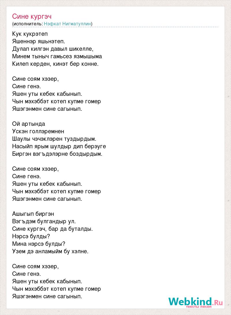 Кук кукрэтеп Яшеннэр яшьнэтеп. Дулап килгэн давыл шикелле, Минем тыныч гамьсез язмышыма Килеп керден, кинэт бер конне. Сине соям хэзер, Сине генэ. Яшен уты кебек кабынып. Чын мэхэббэт котеп купме гомер Яшэгэнмен сине сагынып. Ой артында Ускэн голлэремнен Шаулы чэчэклэрен туздырдым. Насыйп ярым шулдыр дип берэуге Биргэн вэгъдэлэрне боздырдым. Сине соям хэзер, Сине генэ. Яшен уты кебек кабынып. Чын мэхэббэт котеп купме гомер Яшэгэнмен сине сагынып. Ашыгып биргэн Вэгъдэм булгандыр ул. Сине кургэч, бар да буталды. Нэрсэ булды? Мина нэрсэ булды? Узем дэ анламыйм бу хэлне. Сине соям хэзер, Сине генэ. Яшен уты кебек кабынып. Чын мэхэббэт котеп купме гомер Яшэгэнмен сине сагынып.