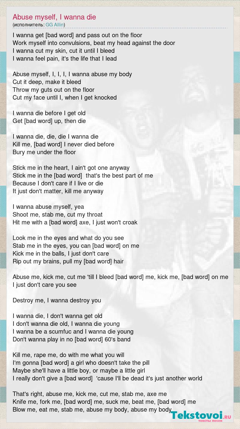 I wanna get [bad word] and pass out on the floor Work myself into convulsions, beat my head against the door I wanna cut my skin, cut it until I bleed I wanna feel pain, it's the life that I lead Abuse myself, I, I, I, I wanna abuse my body Cut it deep, make it bleed Throw my guts out on the floor Cut my face until I, when I get knocked I wanna die before I get old Get [bad word] up, then die I wanna die, die, die I wanna die Kill me, [bad word] I never died before Bury me under the floor Stick me in the heart, I ain't got one anyway Stick me in the [bad word] that's the best part of me Because I don't care if I live or die It just don't matter, kill me anyway I wanna abuse myself, yea Shoot me, stab me, cut my throat Hit me with a [bad word] axe, I just won't croak Look me in the eyes and what do you see Stab me in the eyes, you can [bad word] on me Kick me in the balls, I just don't care Rip out my brains, pull my [bad word] hair Abuse me, kick me, cut me 'till I bleed [bad word] me, kick me, [bad word] on me I just don't care you see Destroy me, I wanna destroy you I wanna die, I don't wanna get old I don't wanna die old, I wanna die young I wanna be a scumfuc and I wanna die young Don't wanna play in no [bad word] 60's band Kill me, rape me, do with me what you will I'm gonna [bad word] a girl who doesn't take the pill Maybe she'll have a little boy, or maybe a little girl I really don't give a [bad word] 'cause I'll be dead it's just another world That's right, abuse me, kick me, cut me, stab me, axe me Knife me, fork me, [bad word] me, suck me, beat me, [bad word] me Blow me, eat me, stab me, abuse my body, abuse my body