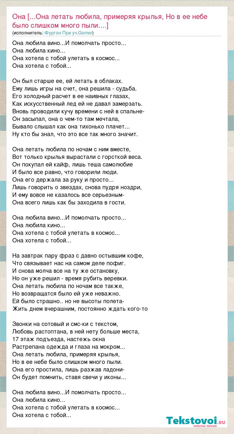Главная→Исполнители→Фургон При уч.Gomer→Она [...Она летать любила, примеряя крылья, Но в ее небе было слишком много