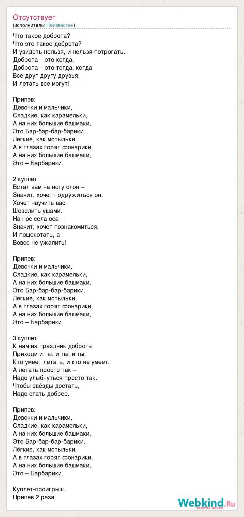 Что такое доброта? Что это такое доброта? И увидеть нельзя, и нельзя потрогать. Доброта – это когда, Доброта – это тогда, когда Все друг другу друзья, И летать все могут! Припев: Девочки и мальчики, Сладкие, как карамельки, А на них большие башмаки, Это Бар-бар-бар-барики. Лёгкие, как мотыльки, А в глазах горят фонарики, А на них большие башмаки, Это – Барбарики. 2 куплет Встал вам на ногу слон – Значит, хочет подружиться он. Хочет научить вас Шевелить ушами. На нос села оса – Значит, хочет познакомиться, И пощекотать, а Вовсе не ужалить! Припев: Девочки и мальчики, Сладкие, как карамельки, А на них большие башмаки, Это Бар-бар-бар-барики. Лёгкие, как мотыльки, А в глазах горят фонарики, А на них большие башмаки, Это – Барбарики. 3 куплет К нам на праздник доброты Приходи и ты, и ты, и ты. Кто умеет летать, и кто не умеет. А летать просто так – Надо улыбнуться просто так. Чтобы звёзды достать, Надо стать добрее. Припев: Девочки и мальчики, Сладкие, как карамельки, А на них большие башмаки, Это Бар-бар-бар-барики. Лёгкие, как мотыльки, А в глазах горят фонарики, А на них большие башмаки, Это – Барбарики. Куплет-проигрыш. Припев 2 раза.