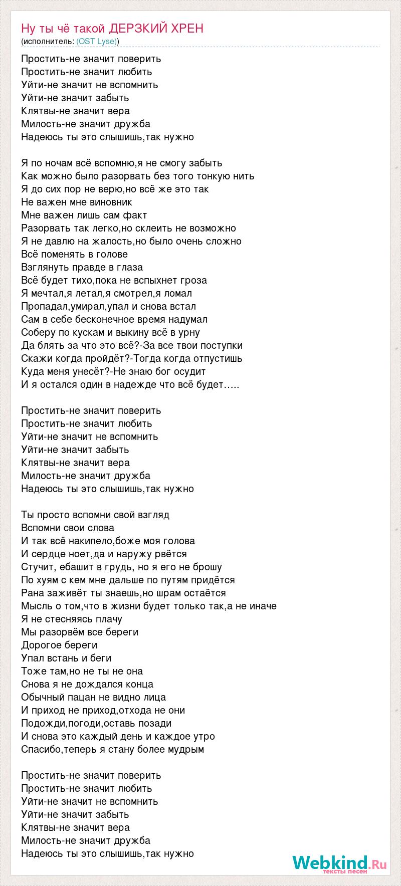 Простить-не значит поверить Простить-не значит любить Уйти-не значит не вспомнить Уйти-не значит забыть Клятвы-не значит вера Милость-не значит дружба Надеюсь ты это слышишь,так нужно Я по ночам всё вспомню,я не смогу забыть Как можно было разорвать без того тонкую нить Я до сих пор не верю,но всё же это так Не важен мне виновник Мне важен лишь сам факт Разорвать так легко,но склеить не возможно Я не давлю на жалость,но было очень сложно Всё поменять в голове Взглянуть правде в глаза Всё будет тихо,пока не вспыхнет гроза Я мечтал,я летал,я смотрел,я ломал Пропадал,умирал,упал и снова встал Сам в себе бесконечное время надумал Соберу по кускам и выкину всё в урну Да блять за что это всё?-За все твои поступки Скажи когда пройдёт?-Тогда когда отпустишь Куда меня унесёт?-Не знаю бог осудит И я остался один в надежде что всё будет….. Простить-не значит поверить Простить-не значит любить Уйти-не значит не вспомнить Уйти-не значит забыть Клятвы-не значит вера Милость-не значит дружба Надеюсь ты это слышишь,так нужно Ты просто вспомни свой взгляд Вспомни свои слова И так всё накипело,боже моя голова И сердце ноет,да и наружу рвётся Стучит, ебашит в грудь, но я его не брошу По хуям с кем мне дальше по путям придётся Рана заживёт ты знаешь,но шрам остаётся Мысль о том,что в жизни будет только так,а не иначе Я не стесняясь плачу Мы разорвём все береги Дорогое береги Упал встань и беги Тоже там,но не ты не она Снова я не дождался конца Обычный пацан не видно лица И приход не приход,отхода не они Подожди,погоди,оставь позади И снова это каждый день и каждое утро Спасибо,теперь я стану более мудрым Простить-не значит поверить Простить-не значит любить Уйти-не значит не вспомнить Уйти-не значит забыть Клятвы-не значит вера Милость-не значит дружба Надеюсь ты это слышишь,так нужно
