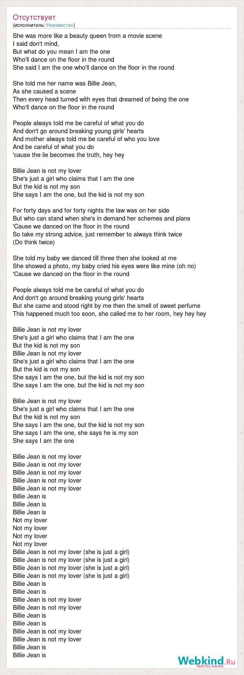 She was more like a beauty queen from a movie scene I said don't mind, But what do you mean I am the one Who'll dance on the floor in the round She said I am the one who'll dance on the floor in the round She told me her name was Billie Jean, As she caused a scene Then every head turned with eyes that dreamed of being the one Who'll dance on the floor in the round People always told me be careful of what you do And don't go around breaking young girls' hearts And mother always told me be careful of who you love And be careful of what you do 'cause the lie becomes the truth, hey hey Billie Jean is not my lover She's just a girl who claims that I am the one But the kid is not my son She says I am the one, but the kid is not my son For forty days and for forty nights the law was on her side But who can stand when she's in demand her schemes and plans 'Cause we danced on the floor in the round So take my strong advice, just remember to always think twice (Do think twice) She told my baby we danced till three then she looked at me She showed a photo, my baby cried his eyes were like mine (oh no) 'Cause we danced on the floor in the round People always told me be careful of what you do And don't go around breaking young girls' hearts But she came and stood right by me then the smell of sweet perfume This happened much too soon, she called me to her room, hey hey hey Billie Jean is not my lover She's just a girl who claims that I am the one But the kid is not my son Billie Jean is not my lover She's just a girl who claims that I am the one But the kid is not my son She says I am the one, but the kid is not my son She says I am the one, but the kid is not my son Billie Jean is not my lover She's just a girl who claims that I am the one But the kid is not my son She says I am the one, but the kid is not my son She says I am the one, she says he is my son She says I am the one Billie Jean is not my lover Billie Jean is not my lover Billie Jean is not my lover Billie Jean is not my lover Billie Jean is not my lover Billie Jean is Billie Jean is Billie Jean is Not my lover Not my lover Not my lover Not my lover Billie Jean is not my lover (she is just a girl) Billie Jean is not my lover (she is just a girl) Billie Jean is not my lover (she is just a girl) Billie Jean is not my lover (she is just a girl) Billie Jean is Billie Jean is Billie Jean is not my lover Billie Jean is not my lover Billie Jean is Billie Jean is Billie Jean is not my lover Billie Jean is not my lover Billie Jean is Billie Jean is