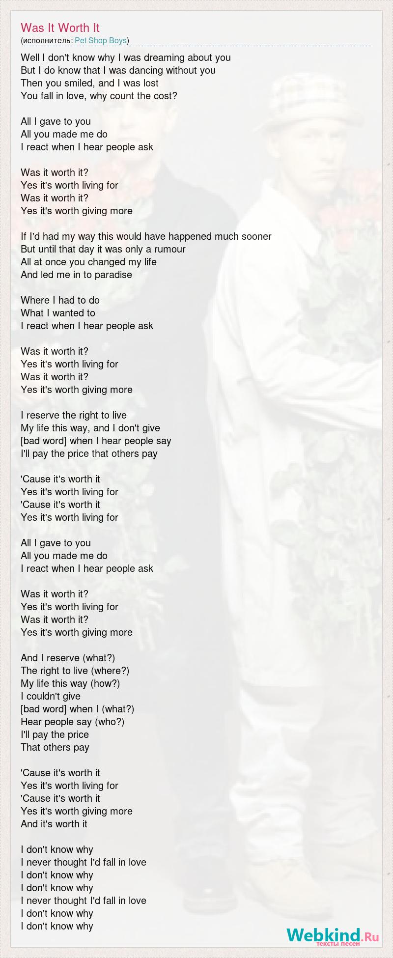 Well I don't know why I was dreaming about you But I do know that I was dancing without you Then you smiled, and I was lost You fall in love, why count the cost? All I gave to you All you made me do I react when I hear people ask Was it worth it? Yes it's worth living for Was it worth it? Yes it's worth giving more If I'd had my way this would have happened much sooner But until that day it was only a rumour All at once you changed my life And led me in to paradise Where I had to do What I wanted to I react when I hear people ask Was it worth it? Yes it's worth living for Was it worth it? Yes it's worth giving more I reserve the right to live My life this way, and I don't give [bad word] when I hear people say I'll pay the price that others pay 'Cause it's worth it Yes it's worth living for 'Cause it's worth it Yes it's worth living for All I gave to you All you made me do I react when I hear people ask Was it worth it? Yes it's worth living for Was it worth it? Yes it's worth giving more And I reserve (what?) The right to live (where?) My life this way (how?) I couldn't give [bad word] when I (what?) Hear people say (who?) I'll pay the price That others pay 'Cause it's worth it Yes it's worth living for 'Cause it's worth it Yes it's worth giving more And it's worth it I don't know why I never thought I'd fall in love I don't know why I don't know why I never thought I'd fall in love I don't know why I don't know why