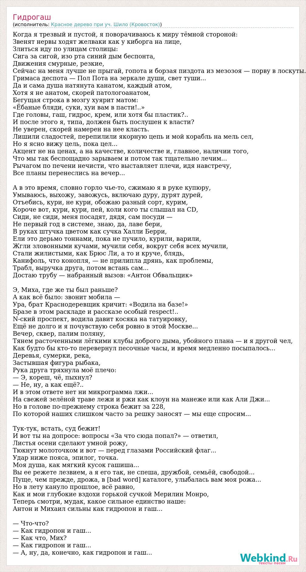Когда я трезвый и пустой, я поворачиваюсь к миру тёмной стороной: Звенят нервы ходят желваки как у киборга на лице, Злиться иду по улицам столицы: Сига за сигой, изо рта синий дым беспонта, Движения смурные, резкие, Сейчас на меня лучше не прыгай, гопота и борзая пиздота из мезозоя — порву в лоскуты. Гримаса деспота — Пол Пота на зеркале души, свет туши... Да и сама душа натянута канатом, каждый атом, Хотя я не анатом, скорей патологоанатом, Бегущая строка в мозгу хуярит матом: «Ёбаные бляди, суки, хуи вам в пасти!..» Где головы, гаш, гидрос, крем, или хотя бы пластик?.. И после этого я, типа, должен быть послушен к власти? Не уверен, скорей намерен на нее класть. Лишили сладостей, перепилили якорную цепь и мой корабль на мель сел, Но я ясно вижу цель, пока цел... Акцент не на ценах, а на качестве, количестве и, главное, наличии того, Что мы так беспощадно зарываем и потом так тщательно лечим... Рычагом по печени нечисти, что выставляет плечи, идя навстречу, Все планы перенеслись на вечер... А в это время, словно горло чье-то, сжимаю я в руке купюру, Умываюсь, выхожу, завожусь, включаю дуру, дурят дурей, Отъебись, кури, не кури, обожаю разный сорт, курим, Короче вот, кури, кури, пей, коли кого ты слышал на CD, Сиди, не сиди, меня посадят, дядя, сам посуди — Не первый год в системе, знаю, да, лаве бери, В руках штучка цветом как сучка Халли Берри, Ели это дерьмо тоннами, пока не пучило, курили, варили, Жгли зловонными кучами, мучили себя, вокруг себя всех мучили, Стали жилистыми, как Брюс Ли, а то и круче, блядь, Канифоль, что конопля, — не прилипла дрянь, как проблемы, Трабл, выручка друга, потом встань сам... Достаю трубу — набранный вызов: «Антон Обвальщик» Э, Миха, где же ты был раньше? А как всё было: звонит мобила — Ура, брат Краснодеревщик кричит: «Водила на базе!» Бразе в этом раскладе и рассказе особый respect!.. N-ский проспект, водила давит косяка на татуировку, Ещё не долго и я почувствую себя ровно в этой Москве... Вечер, сквер, палим поляну, Тянем расточенными лёгкими клубы доброго дыма, убойного плана — и я другой чел, Как будто бы кто-то перевернул песочные часы, и время медленно посыпалось... Деревья, сумерки, река, Застывшая фигура рыбака, Рука друга тряхнула моё плечо: — Э, кореш, чё, пыхнул? — Не, ну, а как ещё?.. И в этом ответе нет ни микрограмма лжи... На свежей зелёной траве лежи и ржи как клоун на манеже или как Али Джи... Но в голове по-прежнему строка бежит за 228, По которой наших слишком часто за решку заносят — мы еще спросим... Тук-тук, встать, суд бежит! И вот ты на допросе: вопросы «За что сюда попал?» — ответил, Листья осени сделают умной рожу, Тюкнут молоточком и вот — перед глазами Российский флаг... Удар ниже пояса, эпилог, точка. Моя душа, как мягкий кусок гашиша... Вы ее режете лезвием, а я его так, не спеша, дружбой, семьёй, свободой... Пуще, чем прежде, дрожа, в [bad word] каталоге, улыбалась вам моя рожа... Но в лету кануло прошлое, всё равно, Как и мои глубокие вздохи горькой сучкой Мерилин Монро, Теперь смотри, мудак, какое сильное единство наше: Антон и Михаил сильны как гидропон и гаш... — Что-что? — Как гидропон и гаш... — Как что, Мих? — Как гидропон и гаш... — А, ну, да, конечно, как гидропон и гаш...