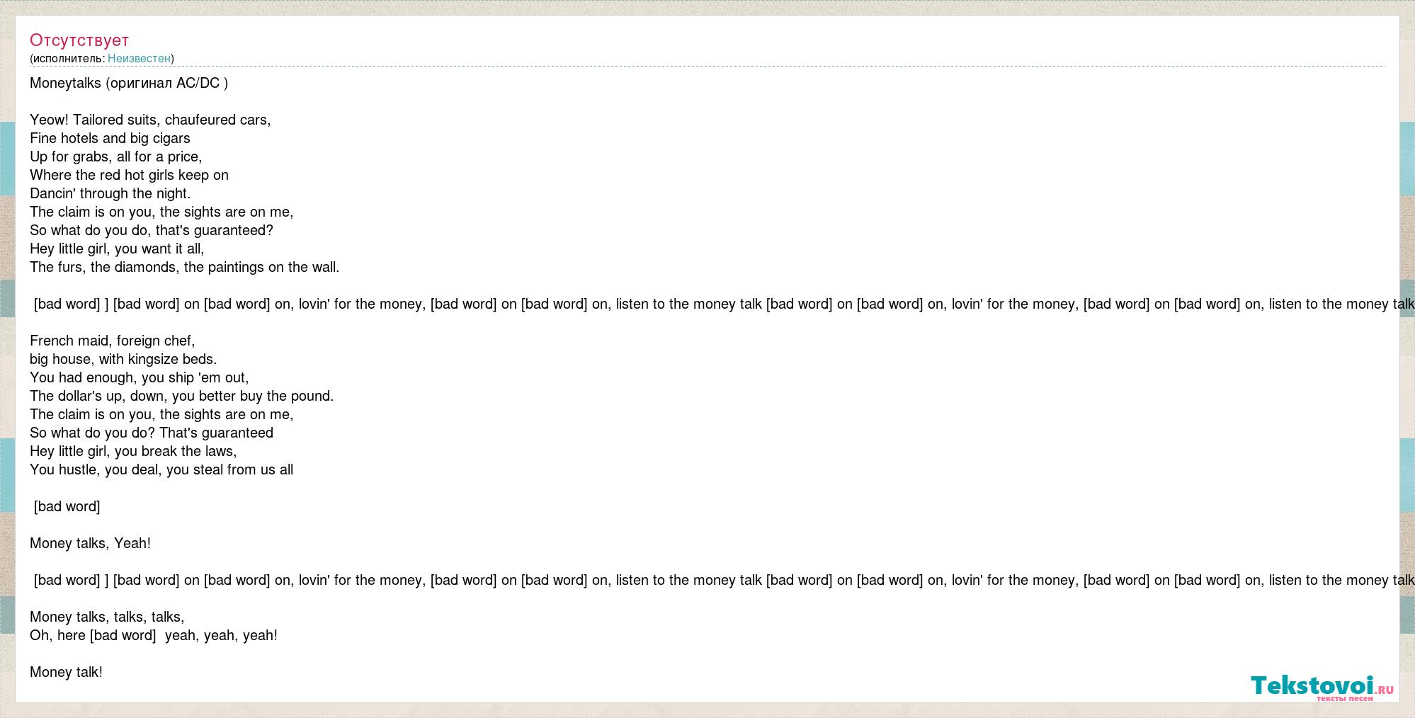 Moneytalks (оригинал AC/DC ) Yeow! Tailored suits, chaufeured cars, Fine hotels and big cigars Up for grabs, all for a price, Where the red hot girls keep on Dancin' through the night. The claim is on you, the sights are on me, So what do you do, that's guaranteed? Hey little girl, you want it all, The furs, the diamonds, the paintings on the wall. [Chorus:] Come on, come on, lovin' for the money, Come on, come on, listen to the money talk Come on, come on, lovin' for the money, Come on, come on, listen to the money talk French maid, foreign chef, big house, with kingsize beds. You had enough, you ship 'em out, The dollar's up, down, you better buy the pound. The claim is on you, the sights are on me, So what do you do? That's guaranteed Hey little girl, you break the laws, You hustle, you deal, you steal from us all [Chorus] Money talks, Yeah! [Chorus:] Come on, come on, lovin' for the money, Come on, come on, listen to the money talk Come on, come on, lovin' for the money, Come on, come on, listen to the money talk Money talks, talks, talks, Oh, here it comes, yeah, yeah, yeah! Money talk!