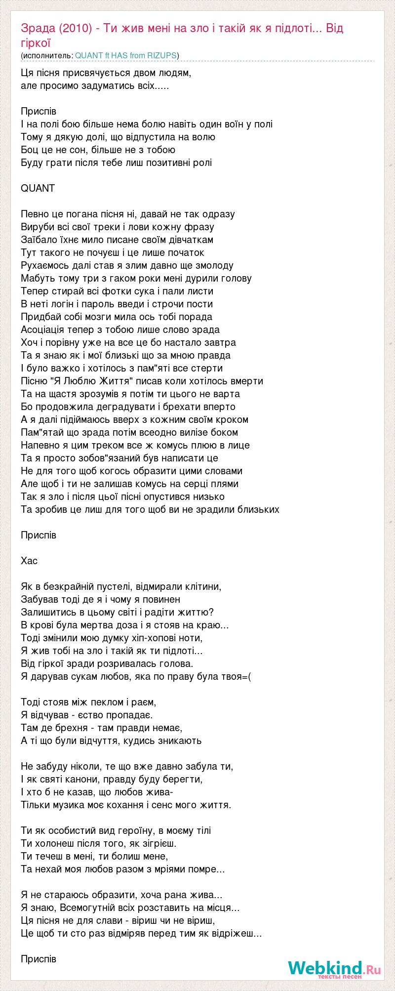 Ця пісня присвячується двом людям, але просимо задуматись всіх..... Приспів І на полі бою більше нема болю навіть один воїн у полі Тому я дякую долі, що відпустила на волю Боц це не сон, більше не з тобою Буду грати після тебе лиш позитивні ролі QUANT Певно це погана пісня ні, давай не так одразу Вируби всі свої треки і лови кожну фразу Заїбало їхнє мило писане своїм дівчаткам Тут такого не почуєш і це лише початок Рухаємось далі став я злим давно ще змолоду Мабуть тому три з гаком роки мені дурили голову Тепер стирай всі фотки сука і пали листи В неті логін і пароль введи і строчи пости Придбай собі мозги мила ось тобі порада Асоціація тепер з тобою лише слово зрада Хоч і порівну уже на все це бо настало завтра Та я знаю як і мої близькі що за мною правда І було важко і хотілось з пам"яті все стерти Пісню "Я Люблю Життя" писав коли хотілось вмерти Та на щастя зрозумів я потім ти цього не варта Бо продовжила деградувати і брехати вперто А я далі підіймаюсь вверх з кожним своїм кроком Пам"ятай що зрада потім всеодно вилізе боком Напевно я цим треком все ж комусь плюю в лице Та я просто зобов"язаний був написати це Не для того щоб когось образити цими словами Але щоб і ти не залишав комусь на серці плями Так я зло і після цьої пісні опустився низько Та зробив це лиш для того щоб ви не зрадили близьких Приспів Хас Як в безкрайній пустелі, відмирали клітини, Забував тоді де я і чому я повинен Залишитись в цьому світі і радіти життю? В крові була мертва доза і я стояв на краю... Тоді змінили мою думку хіп-хопові ноти, Я жив тобі на зло і такій як ти підлоті... Від гіркої зради розривалась голова. Я дарував сукам любов, яка по праву була твоя=( Тоді стояв між пеклом і раєм, Я відчував - єство пропадає. Там де брехня - там правди немає, А ті що були відчуття, кудись зникають Не забуду ніколи, те що вже давно забула ти, І як святі канони, правду буду берегти, І хто б не казав, що любов жива- Тільки музика моє кохання і сенс мого життя. Ти як особистий вид героїну, в моєму тілі Ти холонеш після того, як зігрієш. Ти течеш в мені, ти болиш мене, Та нехай моя любов разом з мріями помре... Я не стараюсь образити, хоча рана жива... Я знаю, Всемогутній всіх розставить на місця... Ця пісня не для слави - віриш чи не віриш, Це щоб ти сто раз відміряв перед тим як відріжеш... Приспів