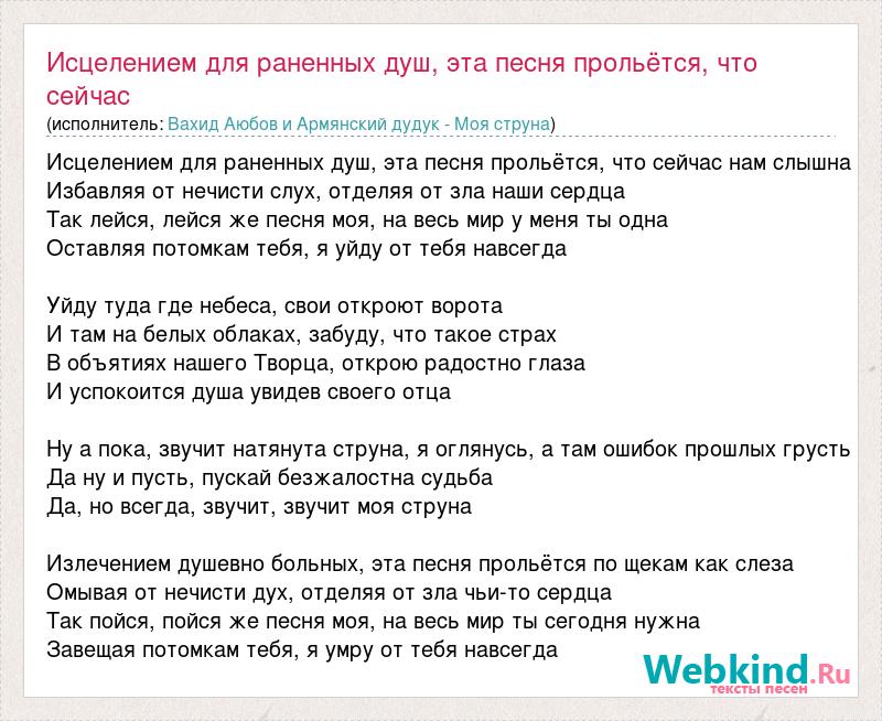 Исцелением для раненных душ, эта песня прольётся, что сейчас нам слышна Избавляя от нечисти слух, отделяя от зла наши сердца Так лейся, лейся же песня моя, на весь мир у меня ты одна Оставляя потомкам тебя, я уйду от тебя навсегда Уйду туда где небеса, свои откроют ворота И там на белых облаках, забуду, что такое страх В объятиях нашего Творца, открою радостно глаза И успокоится душа увидев своего отца Ну а пока, звучит натянута струна, я оглянусь, а там ошибок прошлых грусть Да ну и пусть, пускай безжалостна судьба Да, но всегда, звучит, звучит моя струна Излечением душевно больных, эта песня прольётся по щекам как слеза Омывая от нечисти дух, отделяя от зла чьи-то сердца Так пойся, пойся же песня моя, на весь мир ты сегодня нужна Завещая потомкам тебя, я умру от тебя навсегда
