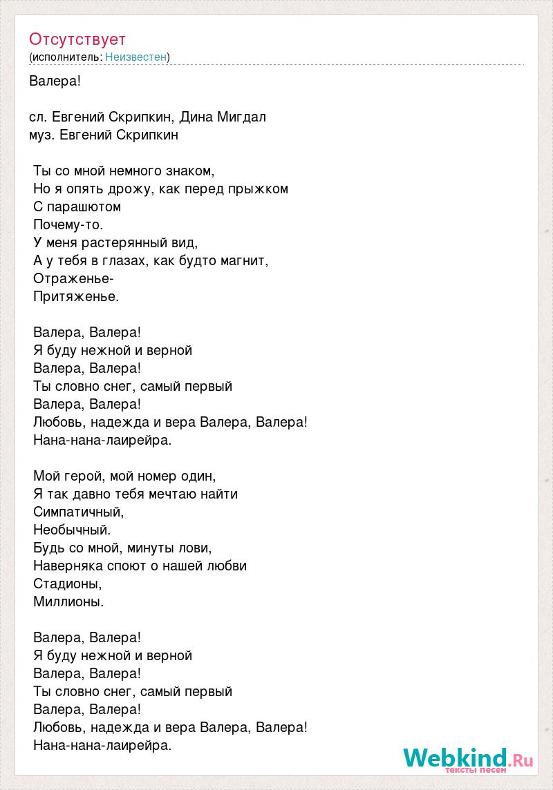 Валера! сл. Евгений Скрипкин, Дина Мигдал муз. Евгений Скрипкин Ты со мной немного знаком, Но я опять дрожу, как перед прыжком С парашютом Почему-то. У меня растерянный вид, А у тебя в глазах, как будто магнит, Отраженье- Притяженье. Валера, Валера! Я буду нежной и верной Валера, Валера! Ты словно снег, самый первый Валера, Валера! Любовь, надежда и вера Валера, Валера! Нана-нана-лаирейра. Мой герой, мой номер один, Я так давно тебя мечтаю найти Симпатичный, Необычный. Будь со мной, минуты лови, Наверняка споют о нашей любви Стадионы, Миллионы. Валера, Валера! Я буду нежной и верной Валера, Валера! Ты словно снег, самый первый Валера, Валера! Любовь, надежда и вера Валера, Валера! Нана-нана-лаирейра.