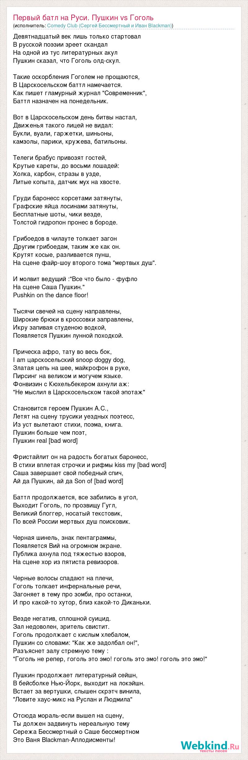Девятнадцатый век лишь только стартовал В русской поэзии зреет скандал На одной из тус литературных акул Пушкин сказал, что Гоголь олд-скул. Такие оскорбления Гоголем не прощаются, В Царскосельском баттл намечается. Как пишет гламурный журнал "Современник", Баттл назначен на понедельник. Вот в Царскосельском день битвы настал, Движенья такого лицей не видал: Букли, вуали, гаржетки, шиньоны, камзолы, парики, кружева, батильоны. Телеги брабус привозят гостей, Крутые кареты, до восьми лошадей: Холка, карбон, стразы в узде, Литые копыта, датчик мух на хвосте. Груди баронесс корсетами затянуты, Графские яйца лосинами затянуты, Бесплатные шоты, чики везде, Толстой гидропон пронес в бороде. Грибоедов в чилауте толкает загон Другим грибоедам, таким же как он. Крутят косые, разливается пунш, На сцене файр-шоу второго тома "мертвых душ". И молвит ведущий :"Все что было - фуфло На сцене Саша Пушкин." Pushkin on the dance floor! Тысячи свечей на сцену направлены, Широкие брюки в кроссовки заправлены, Икру запивая студеною водкой, Появляется Пушкин лунной походкой. Прическа афро, тату во весь бок, I am царскосельский snoop doggy dog, Златая цепь на шее, майкрофон в руке, Пирсинг на великом и могучем языке. Фонвизин с Кюхельбекером ахнули аж: "Не мыслил в Царскосельском такой эпотаж" Становится героем Пушкин А.С., Летят на сцену трусики уездных поэтесс, Из уст вылетают стихи, поэма, книга. Пушкин больше чем поэт, Пушкин real [bad word] Фристайлит он на радость богатых баронесс, В стихи вплетая строчки и рифмы kiss my [bad word] Саша завершает свой победный спич, Ай да Пушкин, ай да Son of [bad word] Баттл продолжается, все забились в угол, Выходит Гоголь, по прозвищу Гугл, Великий блоггер, носатый текстовик, По всей России мертвых душ поисковик. Черная шинель, знак пентаграммы, Появляется Вий на огромном экране. Публика ахнула под тяжестью взоров, На сцене хор из пятиста ревизоров. Черные волосы спадают на плечи, Гоголь толкает инфернальные речи, Загоняет в тему про зомби, про останки, И про какой-то хутор, близ какой-то Диканьки. Везде негатив, сплошной суицид. Зал недоволен, зритель свистит. Гоголь продолжает с кислым хлебалом, Пушкин со словами: "Как же задолбал он!", Разъяснет залу стремную тему : "Гоголь не репер, гоголь это эмо! гоголь это эмо! гоголь это эмо!" Пушкин продолжает литературный сейшн, В бейсболке Нью-Йорк, выходит на локэйшн. Встает за вертушки, слышен скрэтч винила, "Ловите хаус-микс на Руслан и Людмила" Отсюда мораль-если вышел на сцену, Ты должен задвинуть нереальную тему Сережа Бессмертный о Саше бессмертном Это Ваня Blackman-Аплодисменты!