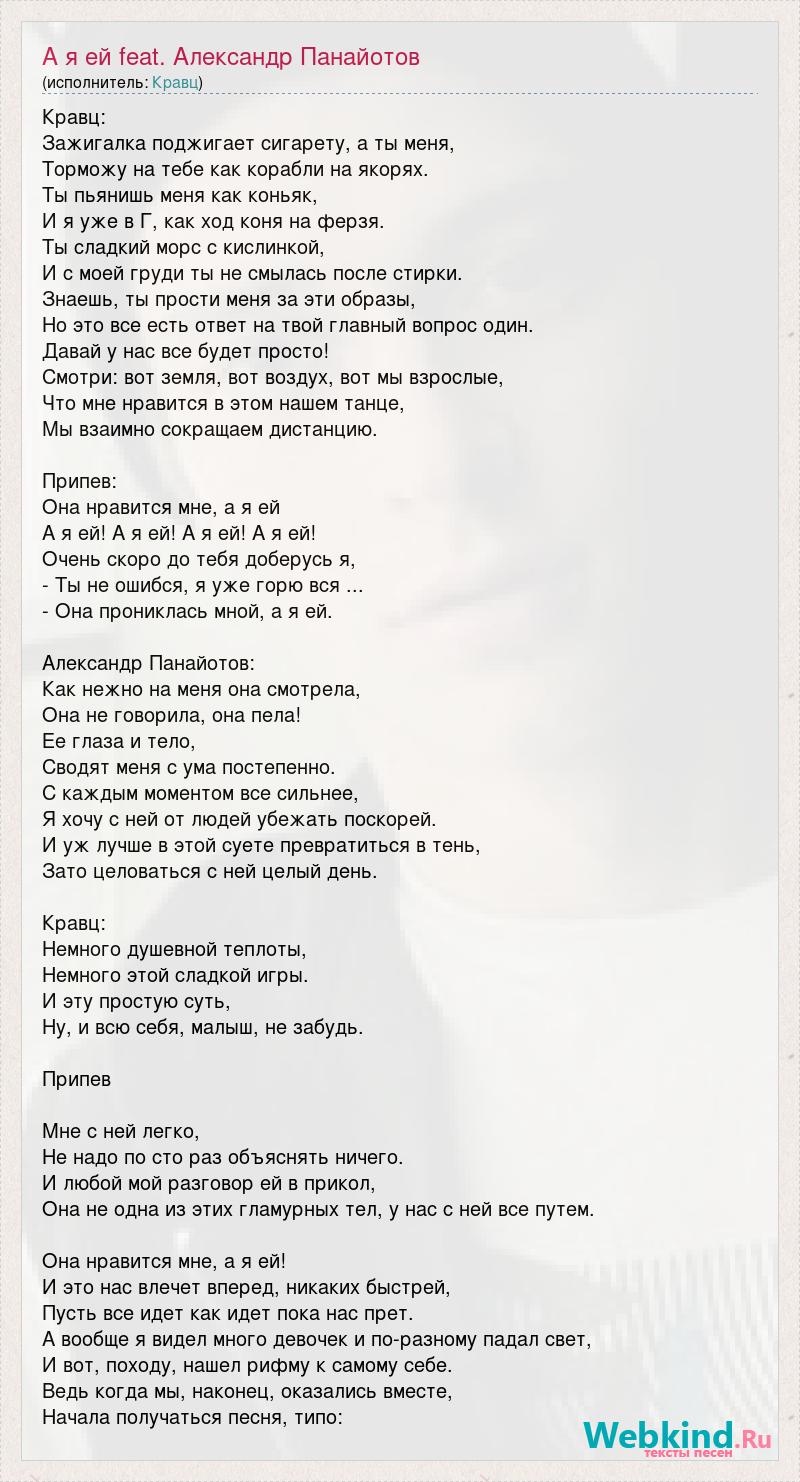 Кравц: Зажигалка поджигает сигарету, а ты меня, Торможу на тебе как корабли на якорях. Ты пьянишь меня как коньяк, И я уже в Г, как ход коня на ферзя. Ты сладкий морс с кислинкой, И с моей груди ты не смылась после стирки. Знаешь, ты прости меня за эти образы, Но это все есть ответ на твой главный вопрос один. Давай у нас все будет просто! Смотри: вот земля, вот воздух, вот мы взрослые, Что мне нравится в этом нашем танце, Мы взаимно сокращаем дистанцию. Припев: Она нравится мне, а я ей А я ей! А я ей! А я ей! А я ей! Очень скоро до тебя доберусь я, - Ты не ошибся, я уже горю вся ... - Она прониклась мной, а я ей. Александр Панайотов: Как нежно на меня она смотрела, Она не говорила, она пела! Ее глаза и тело, Сводят меня с ума постепенно. С каждым моментом все сильнее, Я хочу с ней от людей убежать поскорей. И уж лучше в этой суете превратиться в тень, Зато целоваться с ней целый день. Кравц: Немного душевной теплоты, Немного этой сладкой игры. И эту простую суть, Ну, и всю себя, малыш, не забудь. Припев Мне с ней легко, Не надо по сто раз объяснять ничего. И любой мой разговор ей в прикол, Она не одна из этих гламурных тел, у нас с ней все путем. Она нравится мне, а я ей! И это нас влечет вперед, никаких быстрей, Пусть все идет как идет пока нас прет. А вообще я видел много девочек и по-разному падал свет, И вот, походу, нашел рифму к самому себе. Ведь когда мы, наконец, оказались вместе, Начала получаться песня, типо: