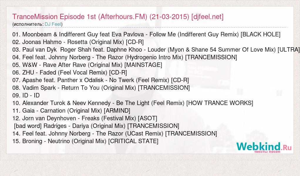 01. Moonbeam & Indifferent Guy feat Eva Pavlova - Follow Me (Indifferent Guy Remix) [BLACK HOLE] 02. Joonas Hahmo - Rosetta (Original Mix) [CD-R] 03. Paul van Dyk Roger Shah feat. Daphne Khoo - Louder (Myon & Shane 54 Summer Of Love Mix) [ULTRA] 04. Feel feat. Johnny Norberg - The Razor (Hydrogenio Intro Mix) [TRANCEMISSION] 05. W&W - Rave After Rave (Original Mix) [MAINSTAGE] 06. ZHU - Faded (Feel Vocal Remix) [CD-R] 07. Apashe feat. Panther x Odalisk - No Twerk (Feel Remix) [CD-R] 08. Vadim Spark - Return To You (Original Mix) [TRANCEMISSION] 09. ID - ID 10. Alexander Turok & Neev Kennedy - Be The Light (Feel Remix) [HOW TRANCE WORKS] 11. Gaia - Carnation (Original Mix) [ARMIND] 12. Jorn van Deynhoven - Freaks (Festival Mix) [ASOT] [bad word] Radriges - Dariya (Original Mix) [TRANCEMISSION] 14. Feel feat. Johnny Norberg - The Razor (UCast Remix) [TRANCEMISSION] 15. Broning - Neutrino (Original Mix) [CRITICAL STATE]
