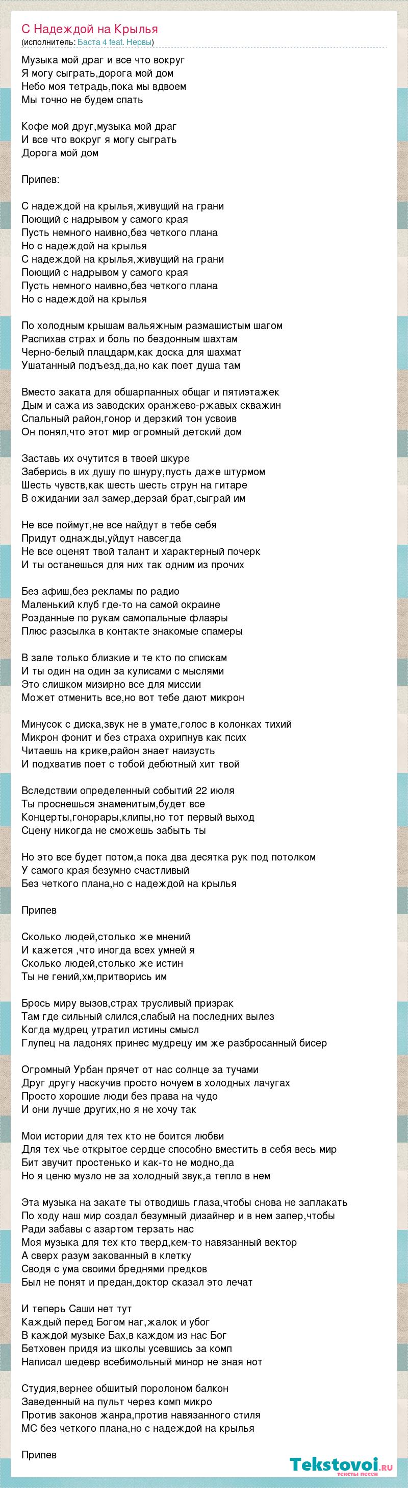 Музыка мой драг и все что вокруг Я могу сыграть,дорога мой дом Небо моя тетрадь,пока мы вдвоем Мы точно не будем спать Кофе мой друг,музыка мой драг И все что вокруг я могу сыграть Дорога мой дом Припев: С надеждой на крылья,живущий на грани Поющий с надрывом у самого края Пусть немного наивно,без четкого плана Но с надеждой на крылья С надеждой на крылья,живущий на грани Поющий с надрывом у самого края Пусть немного наивно,без четкого плана Но с надеждой на крылья По холодным крышам вальяжным размашистым шагом Распихав страх и боль по бездонным шахтам Черно-белый плацдарм,как доска для шахмат Ушатанный подъезд,да,но как поет душа там Вместо заката для обшарпанных общаг и пятиэтажек Дым и сажа из заводских оранжево-ржавых скважин Спальный район,гонор и дерзкий тон усвоив Он понял,что этот мир огромный детский дом Заставь их очутится в твоей шкуре Заберись в их душу по шнуру,пусть даже штурмом Шесть чувств,как шесть шесть струн на гитаре В ожидании зал замер,дерзай брат,сыграй им Не все поймут,не все найдут в тебе себя Придут однажды,уйдут навсегда Не все оценят твой талант и характерный почерк И ты останешься для них так одним из прочих Без афиш,без рекламы по радио Маленький клуб где-то на самой окраине Розданные по рукам самопальные флаэры Плюс разсылка в контакте знакомые спамеры В зале только близкие и те кто по спискам И ты один на один за кулисами с мыслями Это слишком мизирно все для миссии Может отменить все,но вот тебе дают микрон Минусок с диска,звук не в умате,голос в колонках тихий Микрон фонит и без страха охрипнув как псих Читаешь на крике,район знает наизусть И подхватив поет с тобой дебютный хит твой Вследствии определенный событий 22 июля Ты проснешься знаменитым,будет все Концерты,гонорары,клипы,но тот первый выход Сцену никогда не сможешь забыть ты Но это все будет потом,а пока два десятка рук под потолком У самого края безумно счастливый Без четкого плана,но с надеждой на крылья Припев Сколько людей,столько же мнений И кажется ,что иногда всех умней я Сколько людей,столько же истин Ты не гений,хм,притворись им Брось миру вызов,страх трусливый призрак Там где сильный слился,слабый на последних вылез Когда мудрец утратил истины смысл Глупец на ладонях принес мудрецу им же разбросанный бисер Огромный Урбан прячет от нас солнце за тучами Друг другу наскучив просто ночуем в холодных лачугах Просто хорошие люди без права на чудо И они лучше других,но я не хочу так Мои истории для тех кто не боится любви Для тех чье открытое сердце способно вместить в себя весь мир Бит звучит простенько и как-то не модно,да Но я ценю музло не за холодный звук,а тепло в нем Эта музыка на закате ты отводишь глаза,чтобы снова не заплакать По ходу наш мир создал безумный дизайнер и в нем запер,чтобы Ради забавы с азартом терзать нас Моя музыка для тех кто тверд,кем-то навязанный вектор А сверх разум закованный в клетку Сводя с ума своими бреднями предков Был не понят и предан,доктор сказал это лечат И теперь Саши нет тут Каждый перед Богом наг,жалок и убог В каждой музыке Бах,в каждом из нас Бог Бетховен придя из школы усевшись за комп Написал шедевр всебимольный минор не зная нот Студия,вернее обшитый поролоном балкон Заведенный на пульт через комп микро Против законов жанра,против навязанного стиля МС без четкого плана,но с надеждой на крылья 