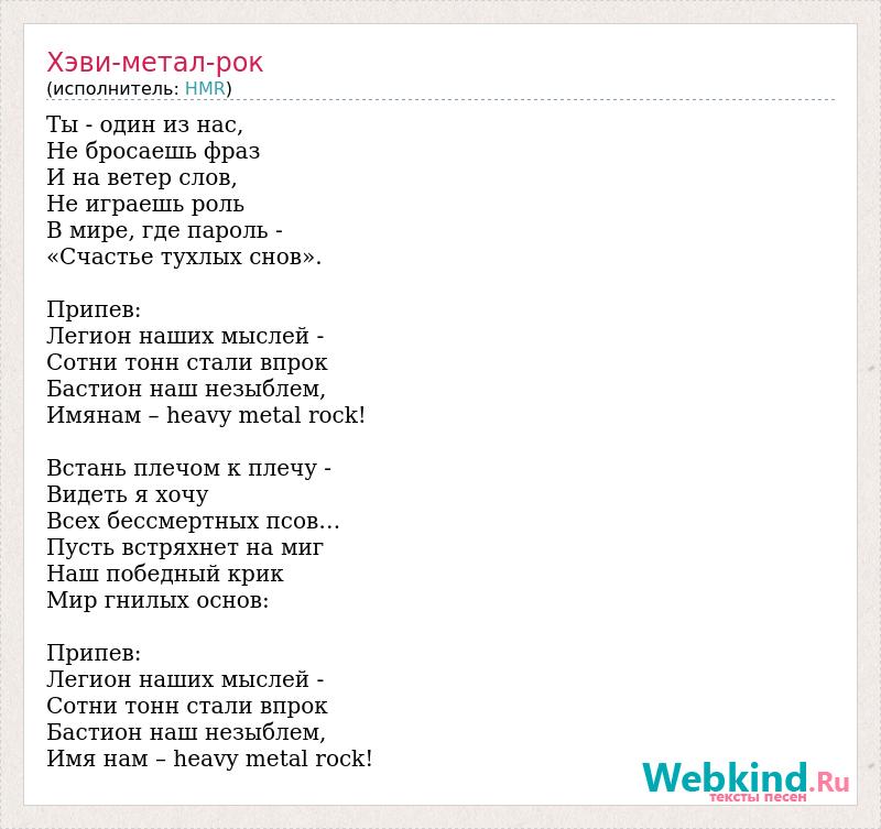 Ты - один из нас, Не бросаешь фраз И на ветер слов, Не играешь роль В мире, где пароль - «Счастье тухлых снов». Припев: Легион наших мыслей - Сотни тонн стали впрок Бастион наш незыблем, Имянам – heavy metal rock! Встань плечом к плечу - Видеть я хочу Всех бессмертных псов… Пусть встряхнет на миг Наш победный крик Мир гнилых основ: Припев: Легион наших мыслей - Сотни тонн стали впрок Бастион наш незыблем, Имя нам – heavy metal rock!